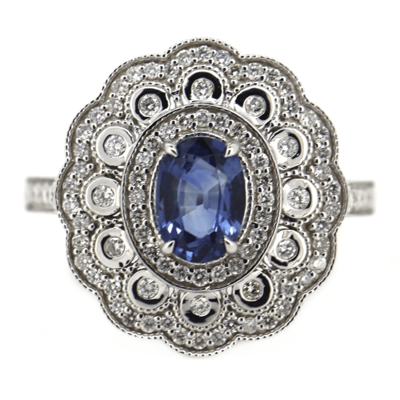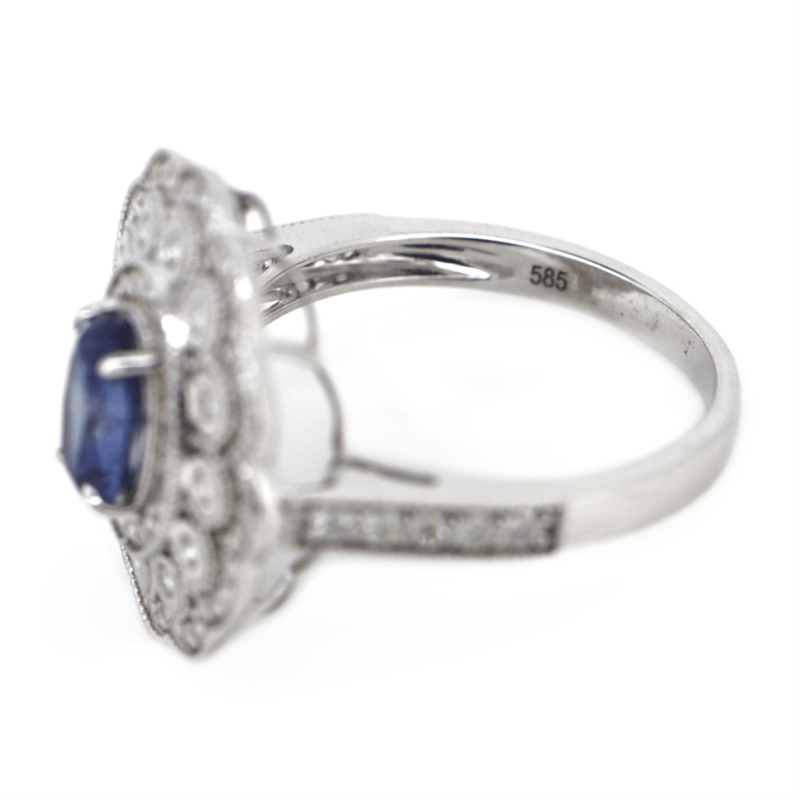 14K WHITE GOLD, 1.12CT BLUE CEYLON SAPPHIRE AND DIAMOND, ORNATE HALO RING.