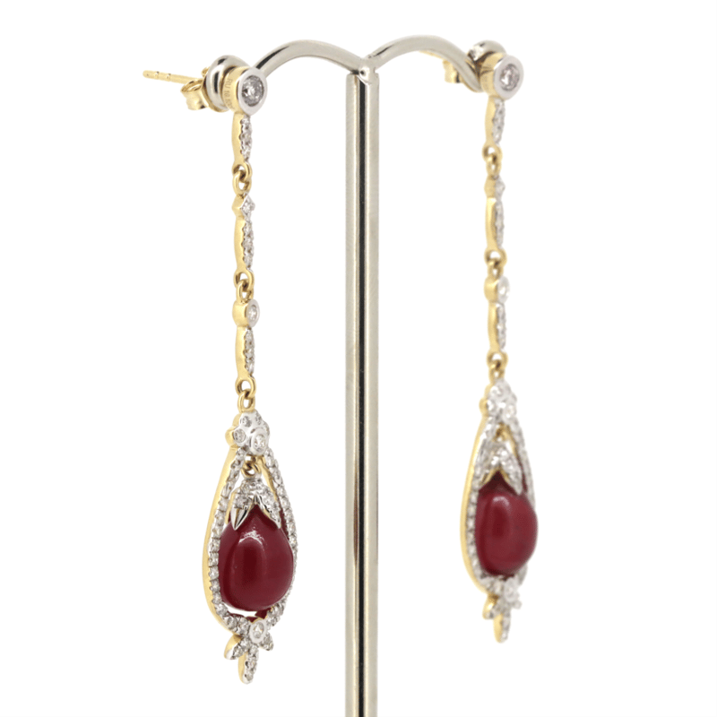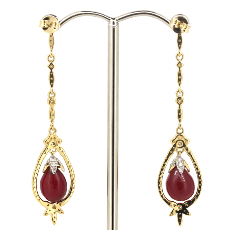 14K YELLOW GOLD, RUBY AND DIAMOND, DROP EARRINGS. The Earrings Feature, 2 Cabochon Teardrop Cut, Deep Red, Rubies, (10.10Ct Tsw, Moderate-Heavy Inclusions), Claw Set. Encompassing The Design Are, 126 Round Brilliant Cut, Diamonds (0.95Ct Tdw, G-H Colour, Si1-Si2 Clarity), Micro Claw Set. Earrings Come With Butterfly Backs. Valuations Provided by an Independent Third-Party Professional Not Directly Associated With Lloyds Auctions at AUD $$22,000.00This valuation has been conducted by an independent third-party professional. The valuation amount is an assessment by the issuing valuer and does not reflect the auction value of the item. Any inquiries regarding the valuation should be directed to the issuing valuer (refer to contact details on the certificate), as Lloyds Auctions has no affiliation or influence over the valuation, the valuer, or the stated amount. Condition: Good - Refer Images 0645960+5343