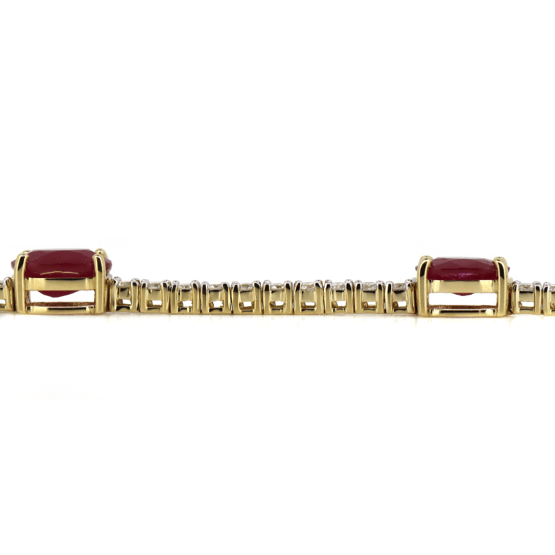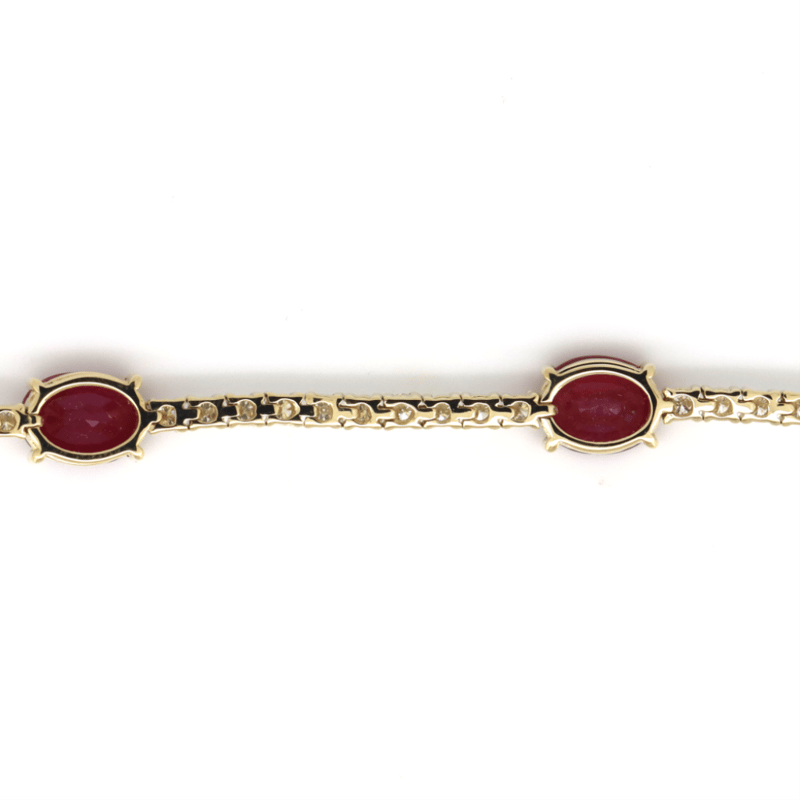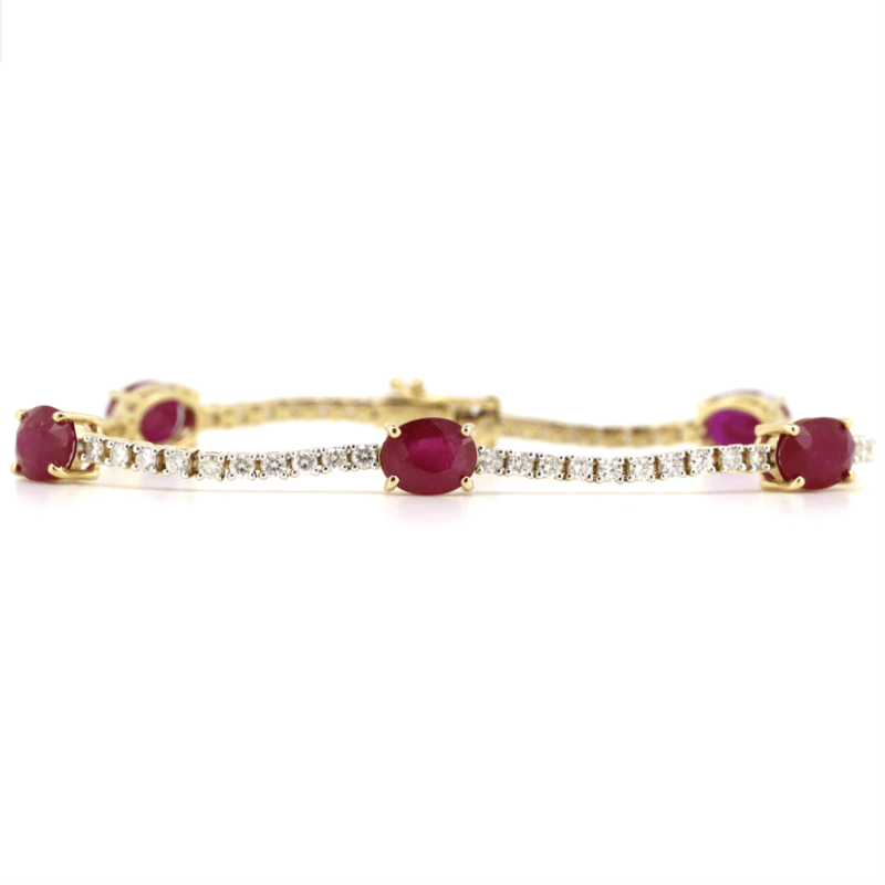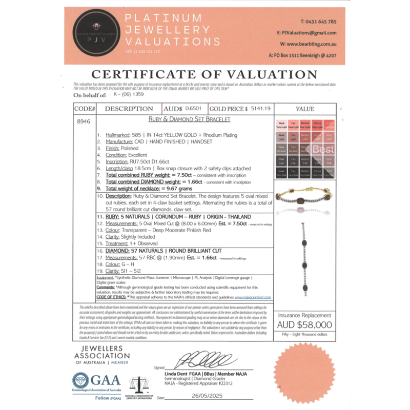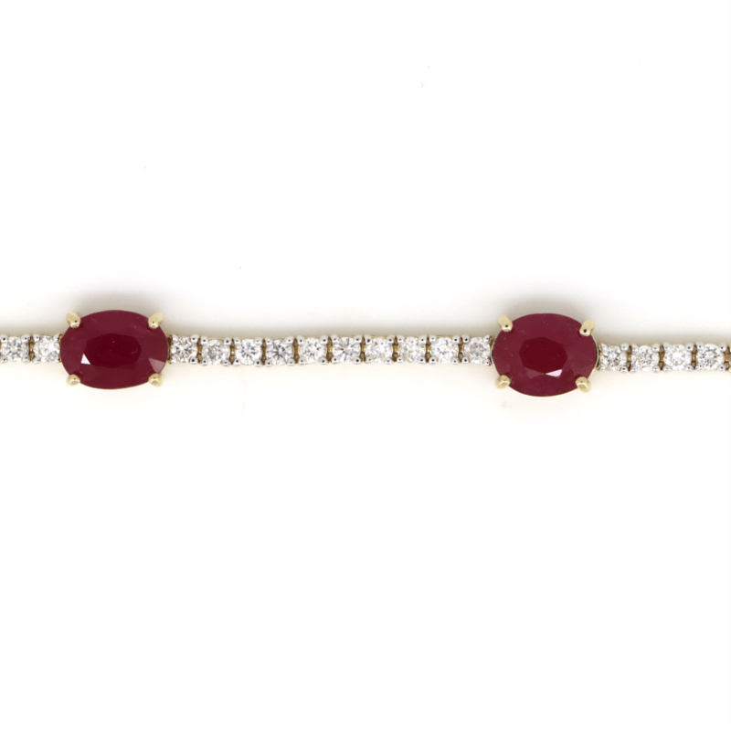 14K YELLOW GOLD, RUBY AND DIAMOND, LINE BRACELET. The Design Features, 5 Oval Cut, Deep Moderate Pinkish-Red, Rubies (7.50Ct Tsw, Slightly Included), Claw Set. Accompanied By 57, Round Brilliant Cut, Diamonds (1.66Ct Tdw, G-H Colour, Si1-Si2 Clarity), Claw Set. The Bracelet Has A Hidden Box Lock Closure With 2 Safety Clips. Bracelet Length Is 18Cm. Valuations Provided by an Independent Third-Party Professional Not Directly Associated With Lloyds Auctions at AUD $$58,000.00This valuation has been conducted by an independent third-party professional. The valuation amount is an assessment by the issuing valuer and does not reflect the auction value of the item. Any inquiries regarding the valuation should be directed to the issuing valuer (refer to contact details on the certificate), as Lloyds Auctions has no affiliation or influence over the valuation, the valuer, or the stated amount. Condition: Good - Refer Images 0645960+5344