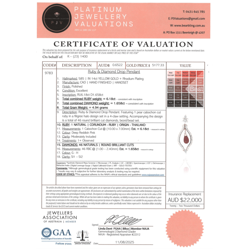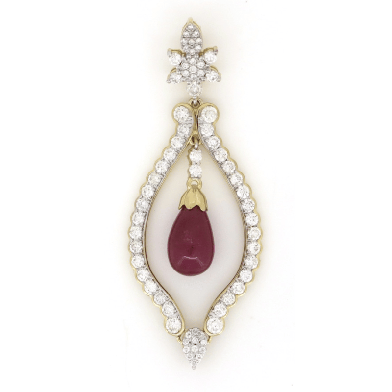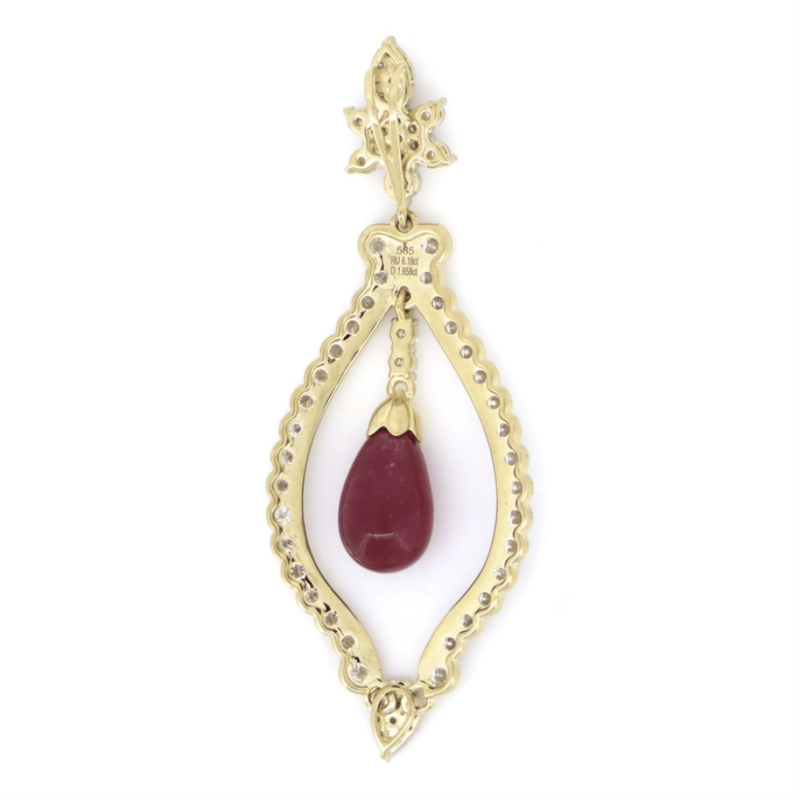 14K YELLOW/WHITE GOLD, RUBY AND DIAMOND, ORNATE PENDANT. The Design Features, One Cabochon Drop Cut, Deep Reddish Pink, Ruby (6.18Ct, Moderately Included, Enhanced), Cap Set. Embellishing The Design Are, 46 Round Brilliant Cut, Diamonds (1.658Ct Tdw, G-H Colour, Si1-Si2 Clarity), Bead/Bezel Set. Valuations Provided by an Independent Third-Party Professional Not Directly Associated With Lloyds Auctions at AUD $$22,000.00This valuation has been conducted by an independent third-party professional. The valuation amount is an assessment by the issuing valuer and does not reflect the auction value of the item. Any inquiries regarding the valuation should be directed to the issuing valuer (refer to contact details on the certificate), as Lloyds Auctions has no affiliation or influence over the valuation, the valuer, or the stated amount. Condition: Good - Refer Images 0645960+5345