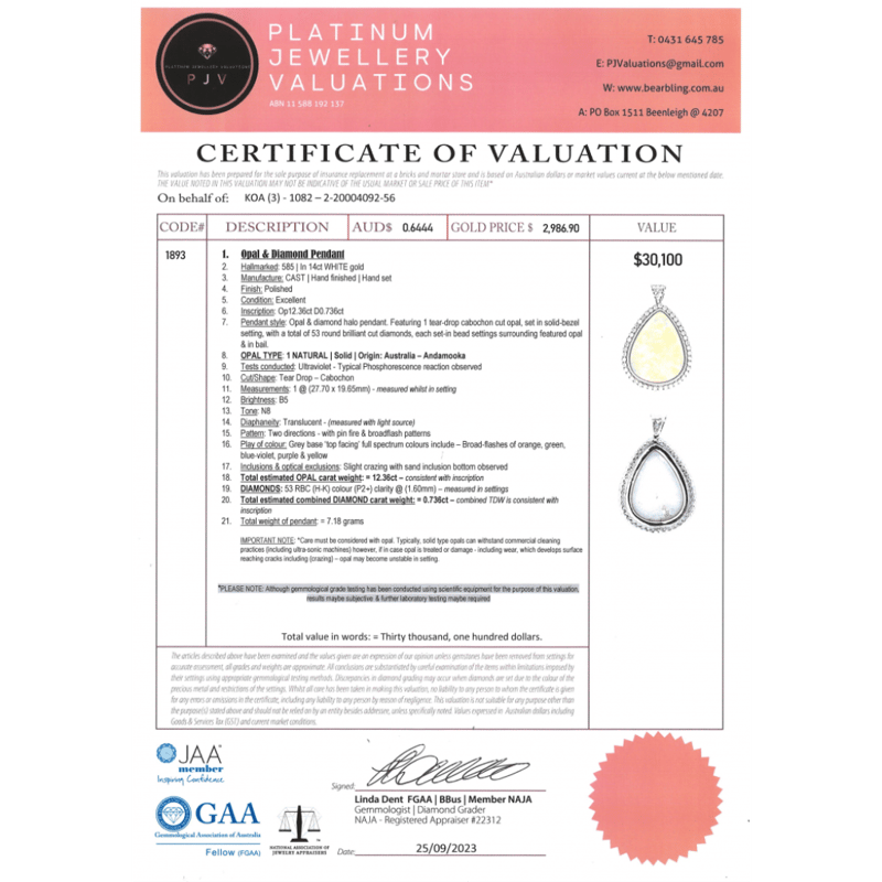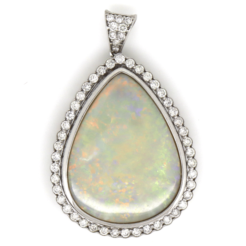 The Centre Features, One Teardrop Cabochon Cut, Solid Grey, Australian Andamooka Opal (12.36Ct, Orange, Green, Blue-Violet, Purple And Yellow, Broad Flash Pattern), Bezel Set. Surrounding The Centre In A Halo And Decorating The Bail Are, 53 Round Brilliant Cut, Diamonds (0.736Ct Tdw, H-K Colour, P2+ Clarity), Bead Set.