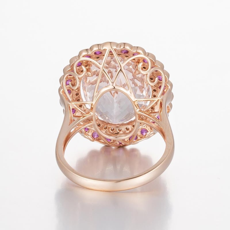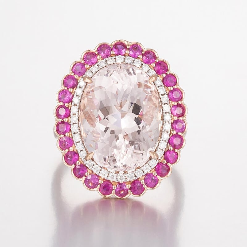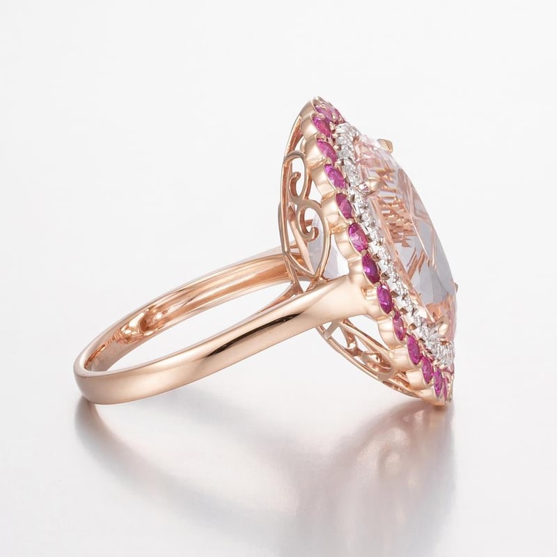 14CT ROSE GOLD BRAZILIAN MORGANITE, PINK MADAGASCAN SAPPHIRE AND DIAMOND COCKTAIL RING