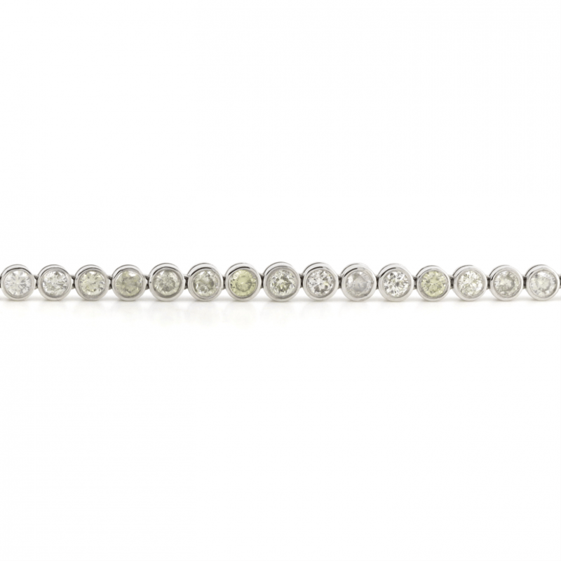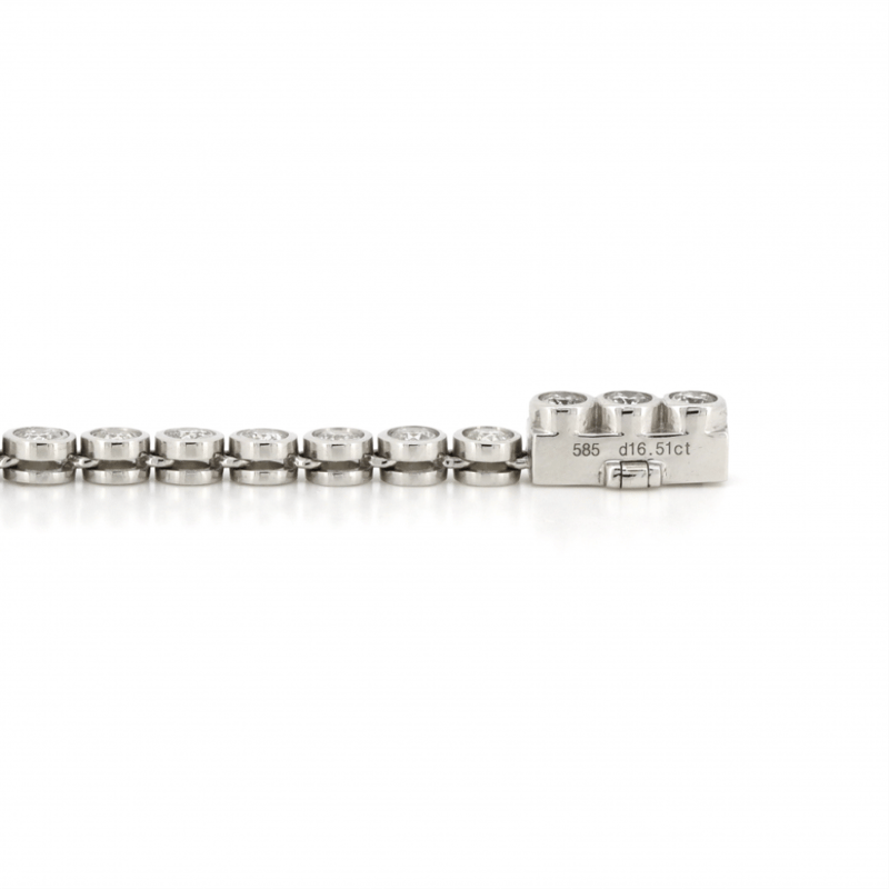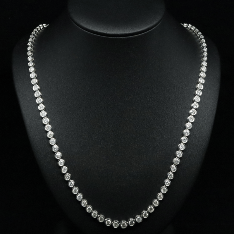 14K WHITE GOLD, 16.51CT TDW DIAMOND, RIVIERA NECKLACE. The Design Features, 103 Round Brilliant Cut, Diamonds (16.51Ct Tdw, G-I Colour, P1+ Clarity), Bezel Set. The Necklace Has Box Lock Clasp, With One Safety Latch. Necklace Length Is 50.5Cm. Valuations Provided by an Independent Third-Party Professional Not Directly Associated With Lloyds Auctions at AUD $$88,500.00This valuation has been conducted by an independent third-party professional. The valuation amount is an assessment by the issuing valuer and does not reflect the auction value of the item. Any inquiries regarding the valuation should be directed to the issuing valuer (refer to contact details on the certificate), as Lloyds Auctions has no affiliation or influence over the valuation, the valuer, or the stated amount. Condition: Good - Refer Images 0645964+5002