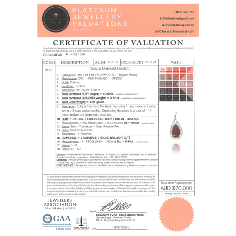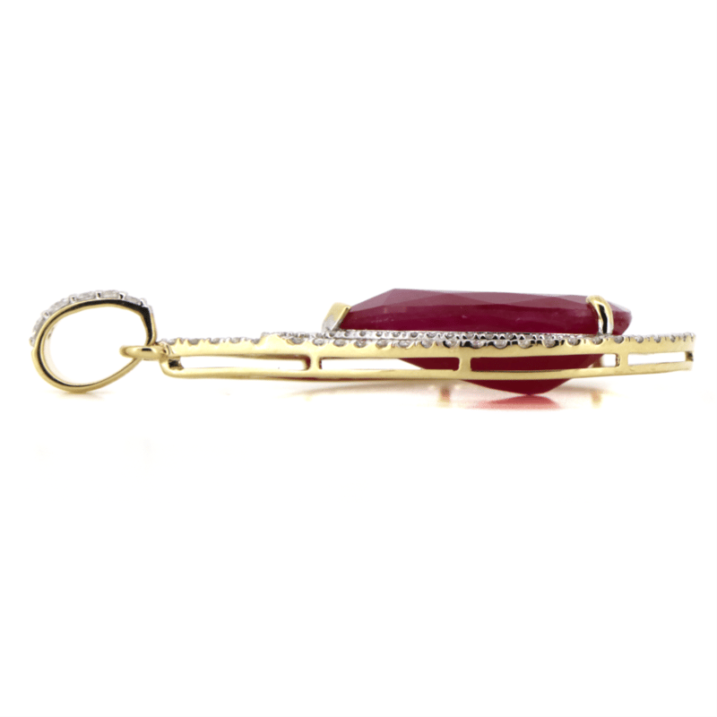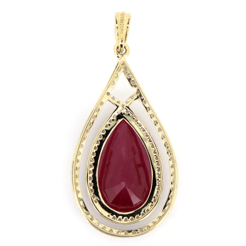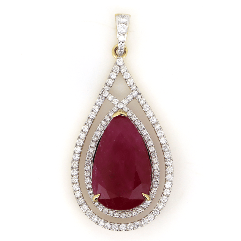 The Centre Features, One Pear Mixed Cut, Ruby (10.69Ct, Moderately Included), 3 Claw Basket Set. Decorating The Piece Are, 111 Round Brilliant Cut, Diamonds (0.84Ct Tdw, G-H Colour, Si1-Si2 Clarity), Bead Set.