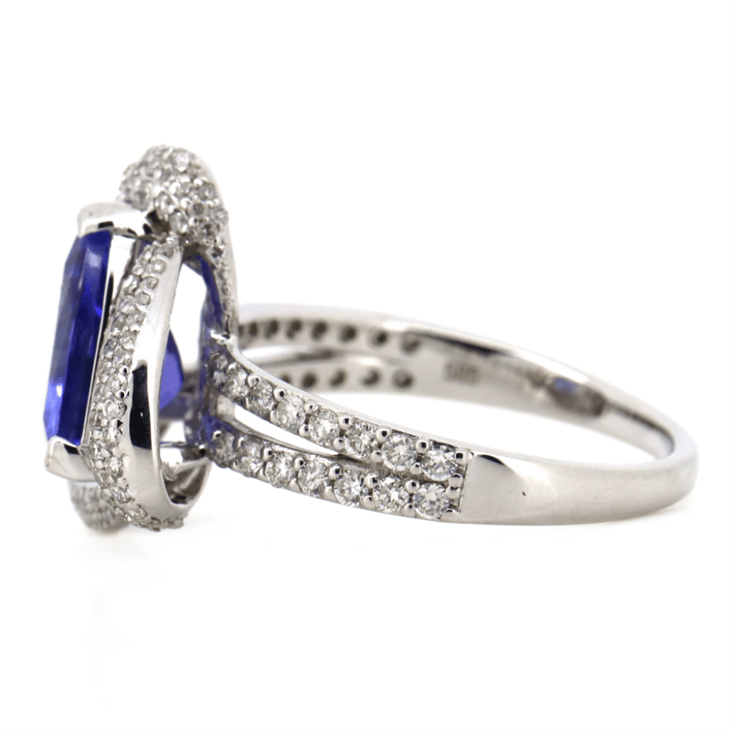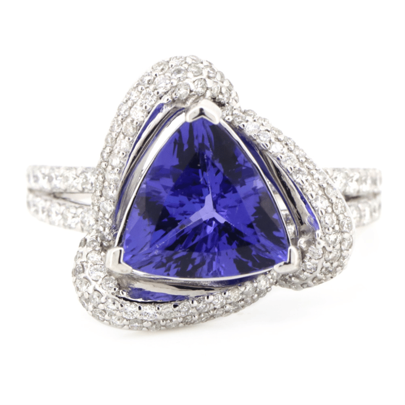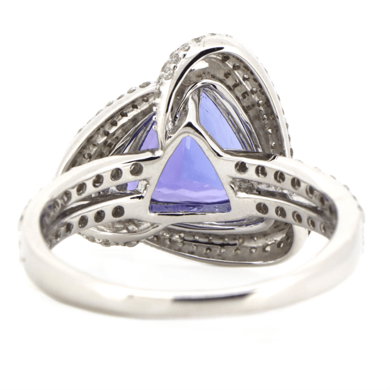 The Centre Features, One Trilliant Mixed Cut, Deep Purple Violet, Tanzanite (3.15Ct, Slightly Included Clarity), V Prong Set. Surrounding The Centre In A Halo And Decorating The Band Are, 144 Round Brilliant Cut, Diamonds (0.81Ct Tdw, G-H Colour, Si - Si2 Clarity), Micro-Bead Set In White Gold. Ring Size Q 1/2.