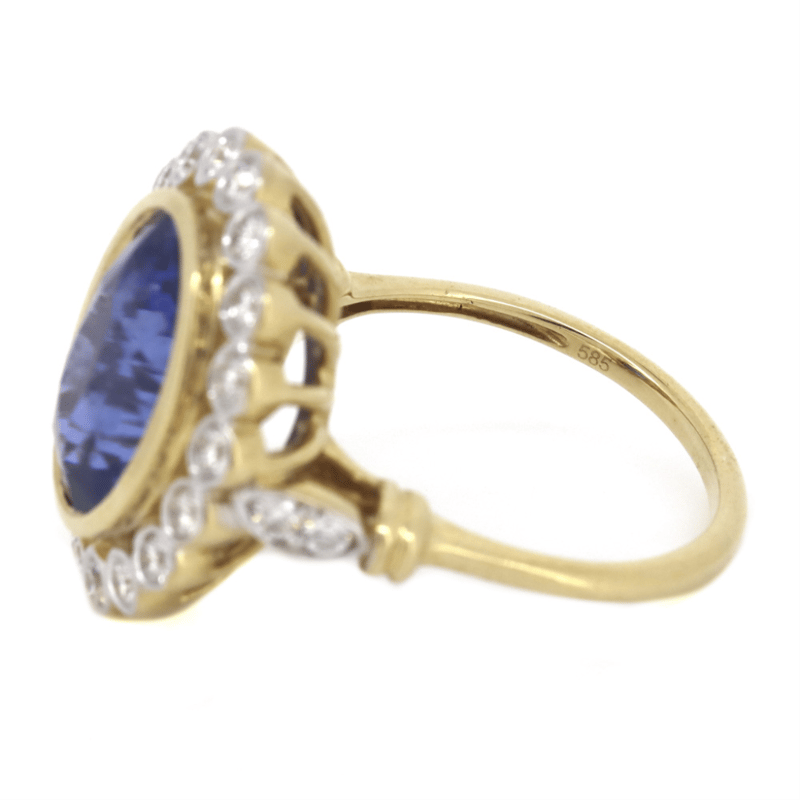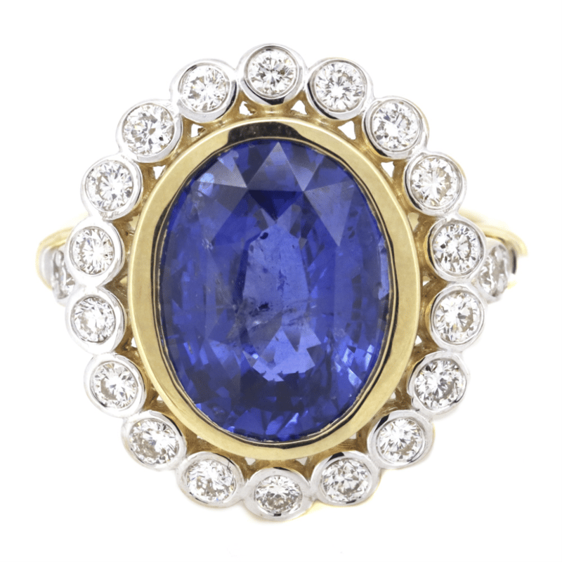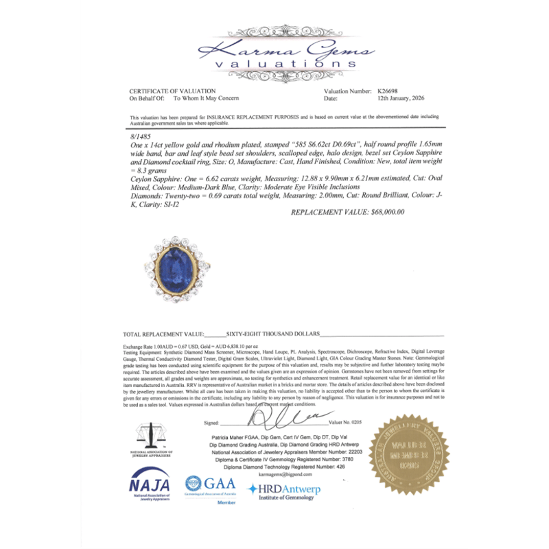 The Centre Features, One Oval Cut, Medium Blue, Ceylon Sapphire (6.62Ct, Minor Eye Visible Inclusions), Bezel Set. Surrounding The Centre In A Halo And Decorating The Shoulders Are, 22 Round Brilliant Cut, Diamonds (0.69Ct Tdw, J-K Colour, Si2-I2 Clarity), Bezel/Bead Set In White Gold. Ring Size O.