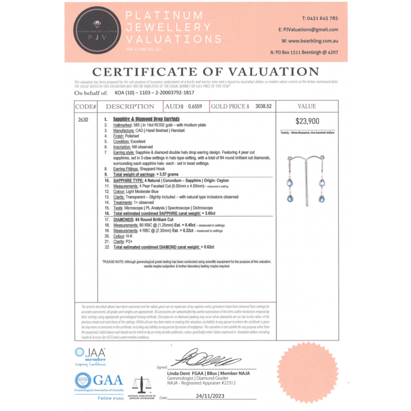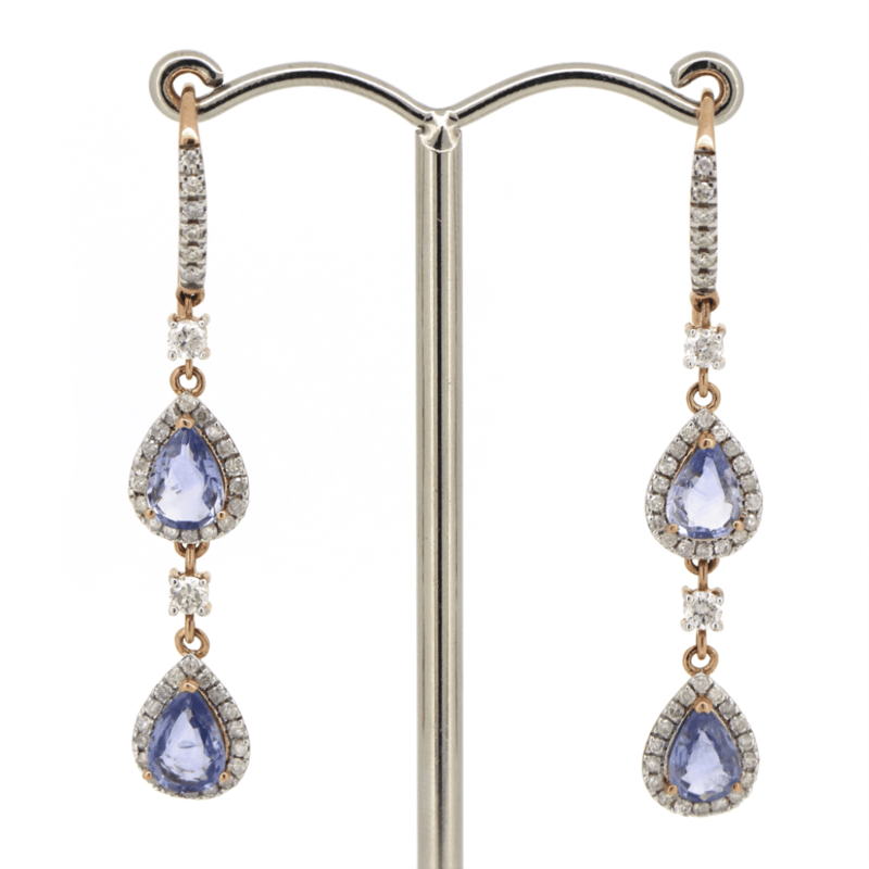 The Drops Feature, 4 Pear Faceted Cut, Light Moderate Blue, Ceylon Sapphires (3.60Ct Tsw, Slightly Included), Claw Set. Encompassing The Drops Are, 84 Round Brilliant Cut, Diamonds (0.62Ct Tdw, H-K Colour, P2+ Clarity), Bead Set. The Earrings Have Shepherd Hooks.