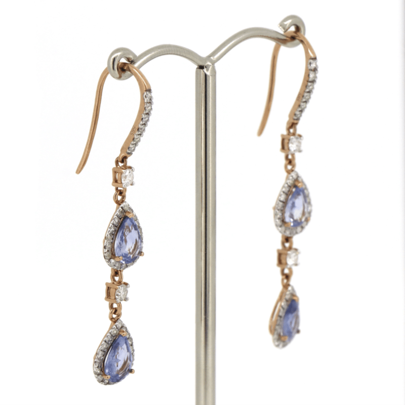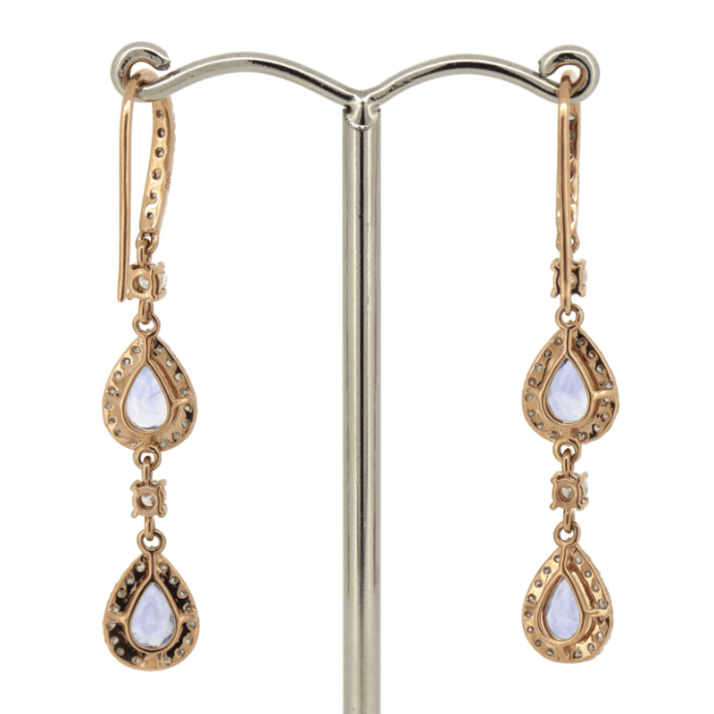 14K ROSE GOLD, 3.60CT TSW BLUE CEYLON SAPPHIRE AND DIAMOND, DROP EARRINGS.