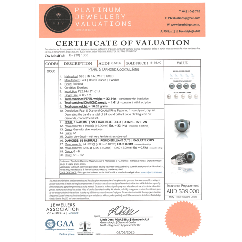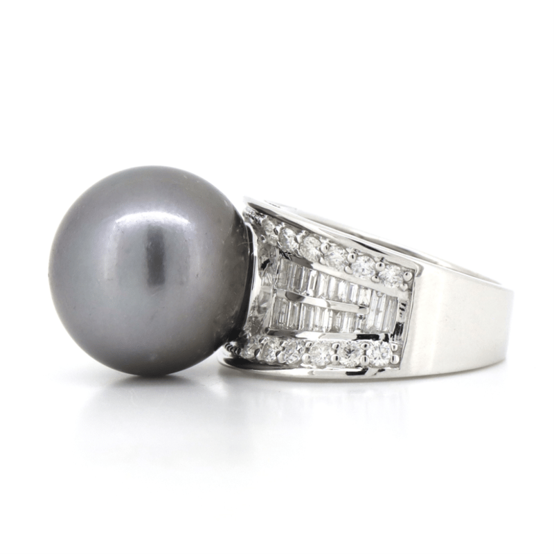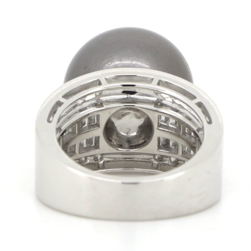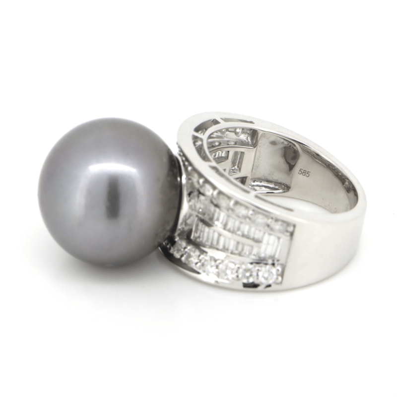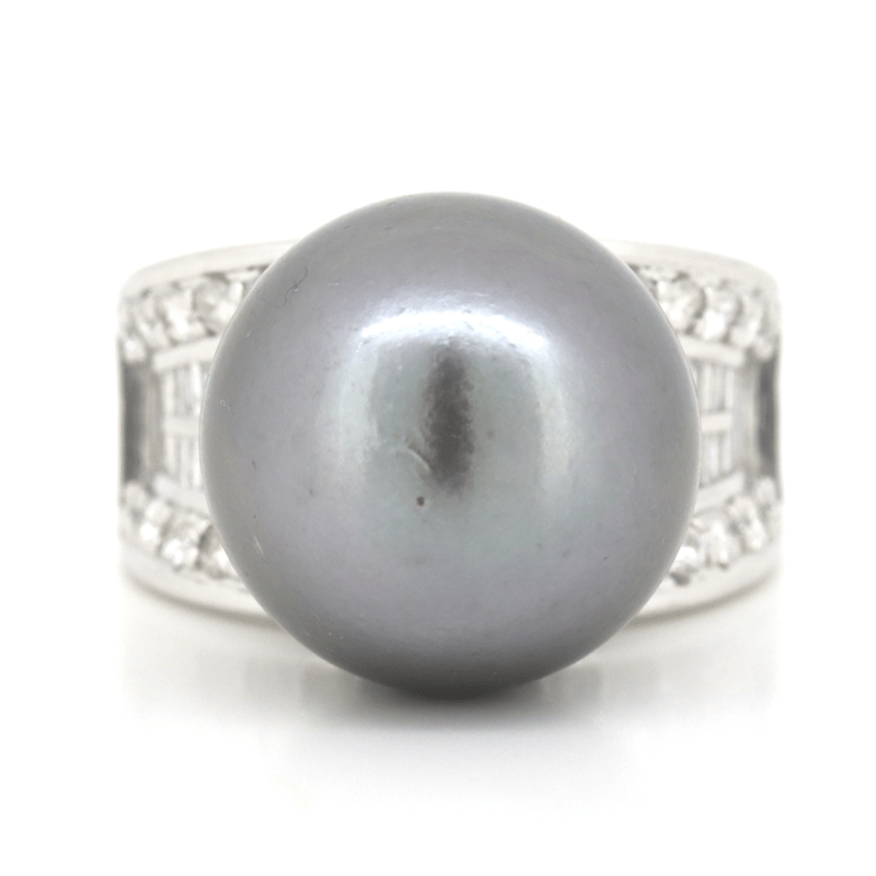 The Centre Feature, One Round Grey With Silver Overtones, Cultured Tahitian Pearl (32.14Ct, 16.00Mm, Aa Lustre, Very Few Blemishes), Cap Set. Decorating The Band Are, 24 Round Brilliant Cut And 32 Baguette Cut, Diamonds (1.61Ct Tdw, G-H Colour, Si1-Si2 Clarity), Channel/Bead Set. Ring Size O.
