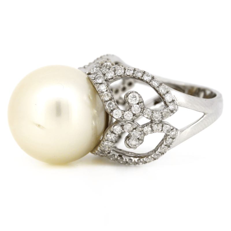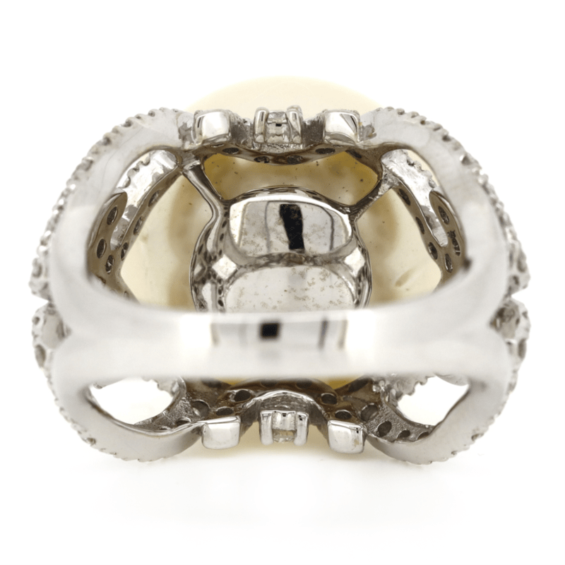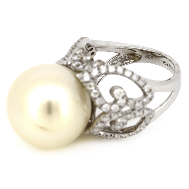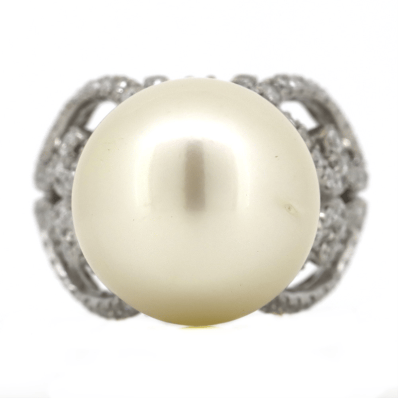 14K WHITE GOLD, CREAM CULTURED SOUTH SEA PEARL AND DIAMOND, COCKTAIL RING.