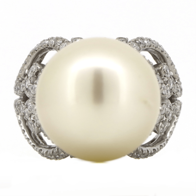The Centre Features, One Near Round, Cream With Silver Overtones, Cultured South Sea Pearl (16.98Mm Size, Medium Lustre, Slightly Blemished). Decorating The Band And Setting Are, 94 Round Brilliant Cut, Diamonds (1.53Ct Tdw, J-K Colour, Si2-I2 Clarity), Micro-Claw Set. Ring Size O 1/2.