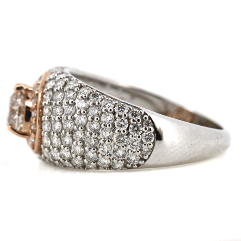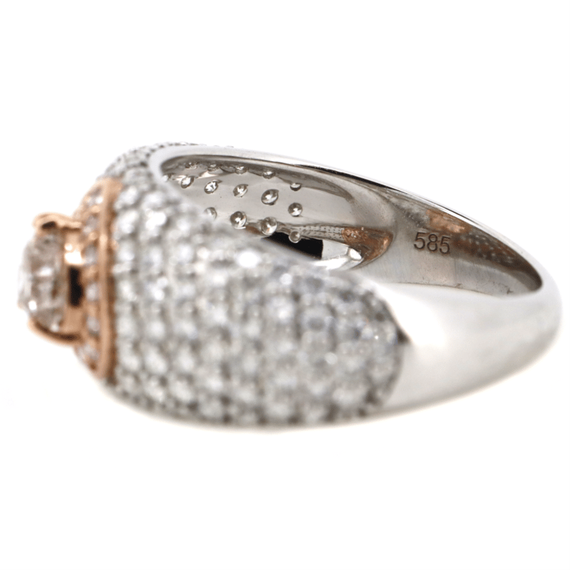 14K ROSE/WHITE GOLD, PINK DIAMOND AND DIAMOND, PAVE BAND RING.