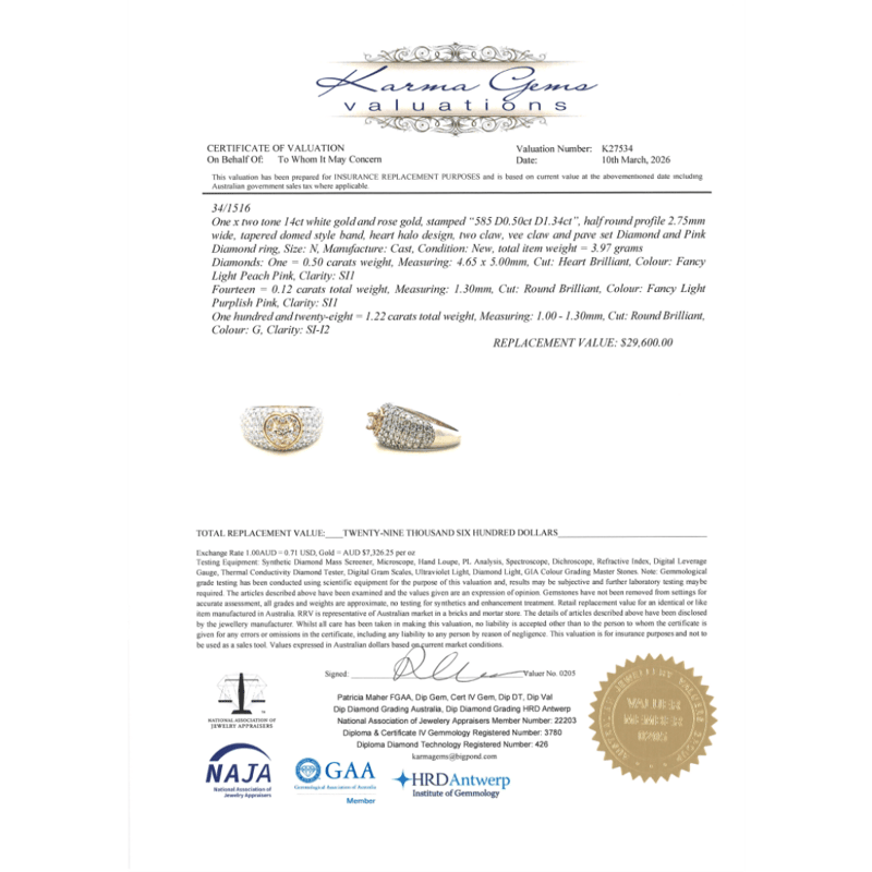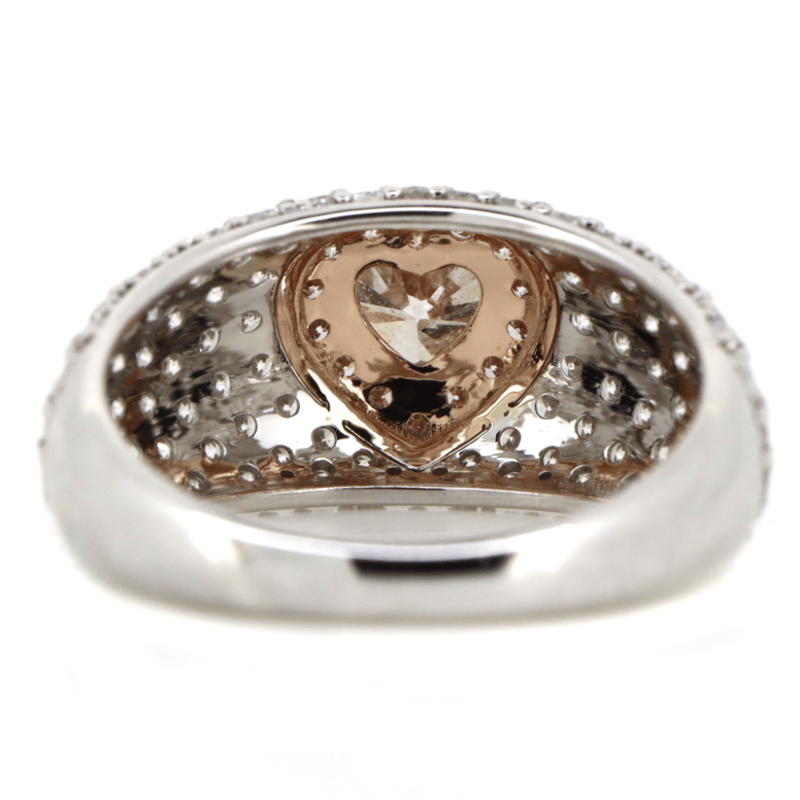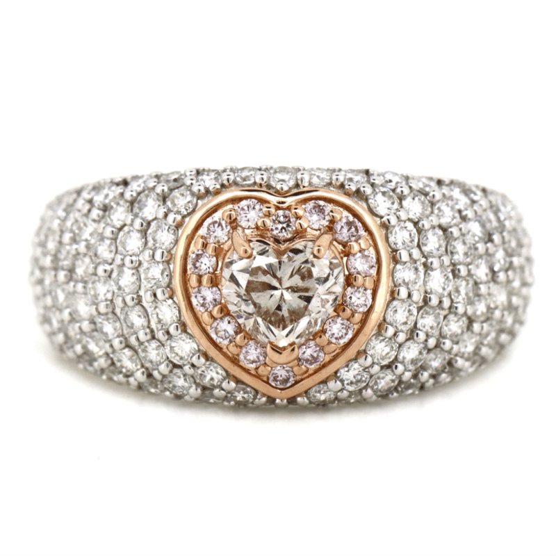 The Centre Features, One Heart Brilliant Cut, Fancy Pink Diamond (0.50Ct, Si1 Clarity), Claw Set In Rose Gold. Encompassing The Centre In A Halo Are, 14 Round Brilliant Cut, Fancy Purplish Pink Diamonds (0.12Ct Tdw, Si1 Clarity), Bead Set In Rose Gold. Embellishing The Design Are, 128 Round Brilliant Cut, Diamonds (1.22Ct Tdw, G Colour, Si-I2 Clarity), Bead Set In White Gold. Ring Size N.