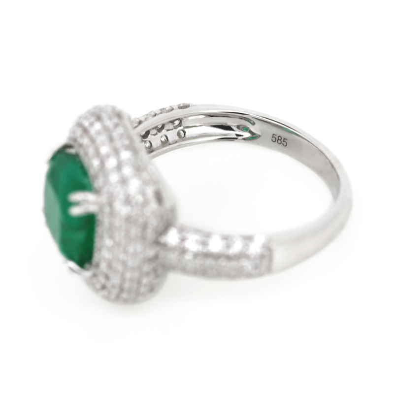 14K WHITE GOLD, EMERALD AND DIAMOND, CLUSTER HALO RING.