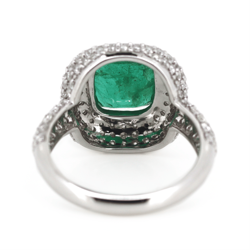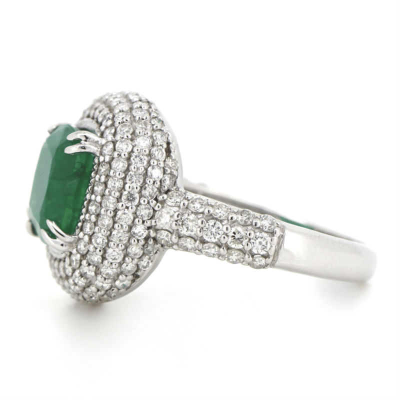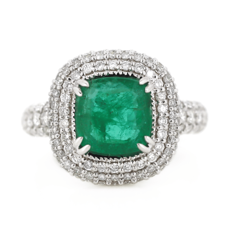 The Centre Features, One Cushion Cut, Strong Moderate Green, Emerald (2.28Ct, Moderate Inclusions), Double 4 Claw Set. Surrounding The Centre And Decorating The Band In A Cluster Are, 156 Round Brilliant Cut, Diamonds (1.29Ct Tdw, G-H Colour, Si1-Si2 Clarity), Channel/Micro-Bead Set. Ring Size M 1/2.