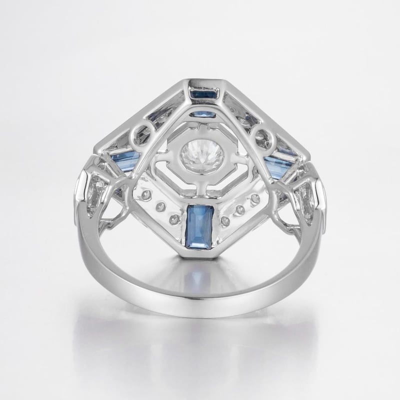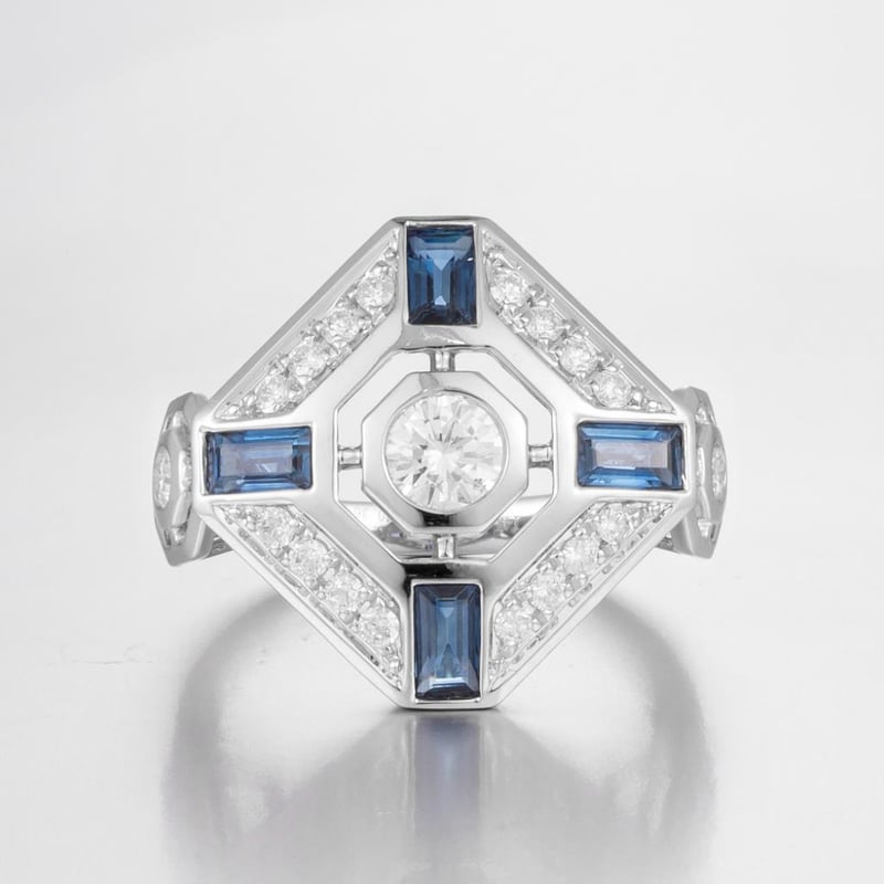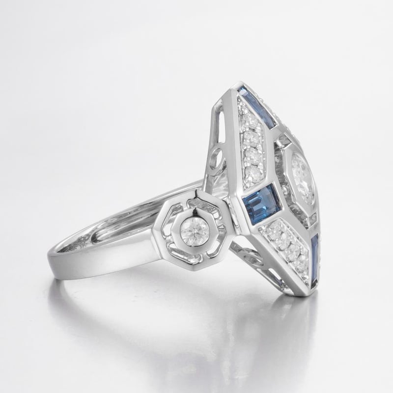14CT WHITE GOLD CEYLON SAPPHIRE AND DIAMOND ART DECO INSPIRED RING