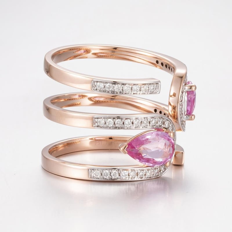 14CT ROSE GOLD PINK CEYLON SAPPHIRE AND DIAMOND SPIRAL RING