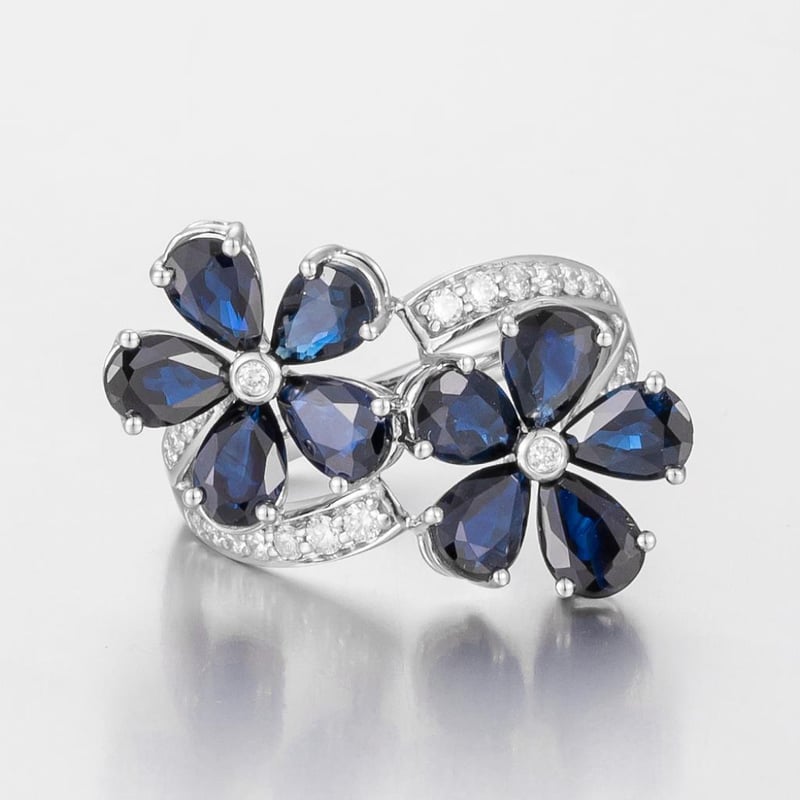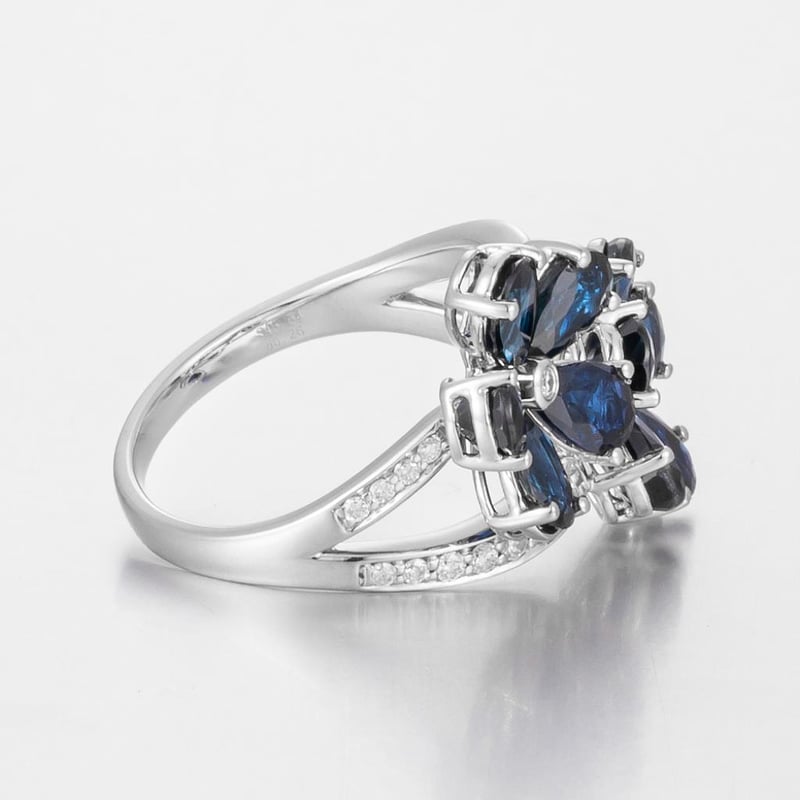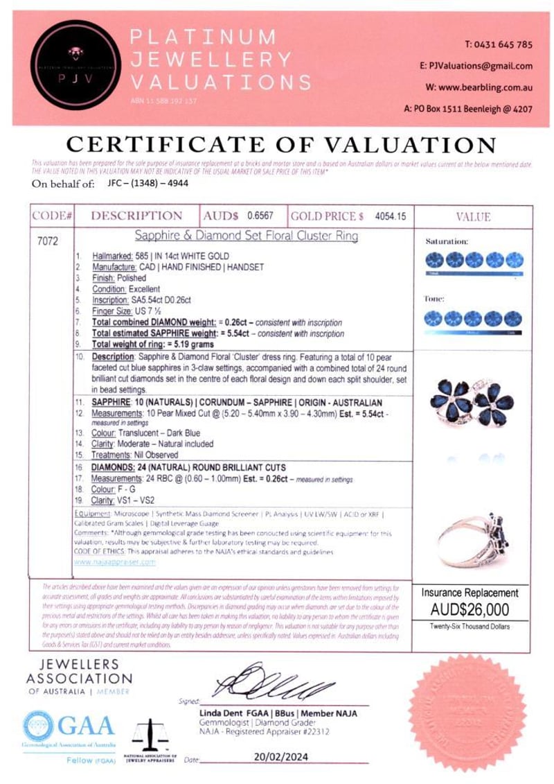 14CT WHITE GOLD AUSTRALIAN SAPPHIRE AND DIAMOND FLORAL TWIST RING Featuring Centre, 10 Oval Cut, Dark Blue Australian Sapphires (5.54Ct Tsw, Moderately Included), Claw Set, With 24 Round Brilliant Cut Diamonds (0.26Ct Tdw, F-G Colour, Vs1-Vs2 Clarity), Bead Set. Ring Size O. Valuations Provided by an Independent Third-Party Professional Not Directly Associated With Lloyds Auctions at AUD $26000This valuation has been conducted by an independent third-party professional. The valuation amount is an assessment by the issuing valuer and does not reflect the auction value of the item. Any inquiries regarding the valuation should be directed to the issuing valuer (refer to contact details on the certificate), as Lloyds Auctions has no affiliation or influence over the valuation, the valuer, or the stated amount. Condition: Good - Refer Images 0584523+701
