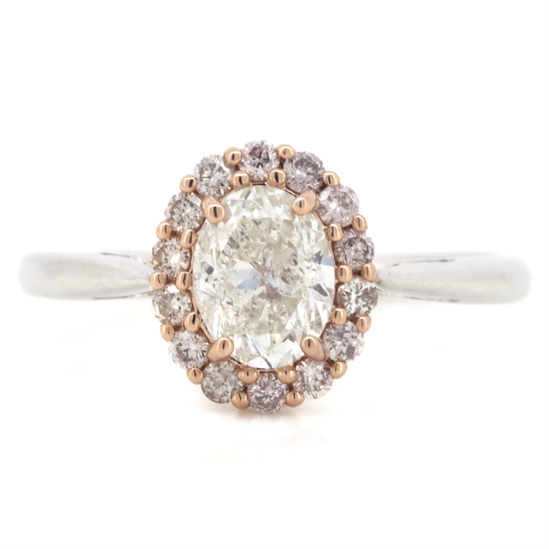 The Centre Features, One Oval Brilliant Cut, Diamond (1.01Ct, H Colour, I1-2 Clarity), Claw Set. Decorating The Centre Are, 14 Round Brilliant Cut, Fancy Champagne And Pink Diamonds (0.30Ct Tdw, Si-I1 Clarity), Claw Set. Ring Size P.