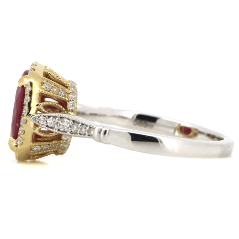 14K WHITE/YELLOW GOLD, RUBY AND DIAMOND, HALO RING. The Centre Features, One Cushion Cut, Deep Moderate Reddish-Pink, Ruby (1.83Ct, Moderate Inclusions), 4 Claw Set In Yellow Gold. Surrounding The Centre In A Halo And Decorating The Setting/Shoulders Are, 64 Round Brilliant Cut, Diamonds (0.31Ct Tdw, G-H Colour, Si1-Si2 Clarity), Micro-Claw Set In Yellow/White Gold With Millegrain Detail. Ring Size N 1/2. Valuations Provided by an Independent Third-Party Professional Not Directly Associated With Lloyds Auctions at AUD $$23,000.00This valuation has been conducted by an independent third-party professional. The valuation amount is an assessment by the issuing valuer and does not reflect the auction value of the item. Any inquiries regarding the valuation should be directed to the issuing valuer (refer to contact details on the certificate), as Lloyds Auctions has no affiliation or influence over the valuation, the valuer, or the stated amount. Condition: Good - Refer Images 0645968+5106