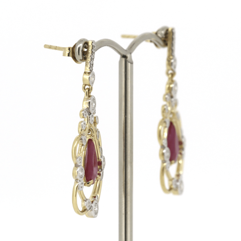 14K YELLOW GOLD/RHODIUM, RUBY AND DIAMOND, DROP EARRINGS. The Design Features, 2 Pear Cut, Moderate Pinkish-Red, Rubies (2.88Ct Tsw, Moderately Included, Enhanced), 3 Claw Set In Yellow Gold. Embellishing The Design Are, 46 Round Brilliant Cut, Diamonds (0.63Ct Tdw, G-H Colour, Si1-Si2 Clarity), Micro-Bead/Bezel Set With Rhodium Plating. The Earrings Have Post Backs With Butterfly Clasps. Valuations Provided by an Independent Third-Party Professional Not Directly Associated With Lloyds Auctions at AUD $$28,000.00This valuation has been conducted by an independent third-party professional. The valuation amount is an assessment by the issuing valuer and does not reflect the auction value of the item. Any inquiries regarding the valuation should be directed to the issuing valuer (refer to contact details on the certificate), as Lloyds Auctions has no affiliation or influence over the valuation, the valuer, or the stated amount. Condition: Good - Refer Images 0645968+5107