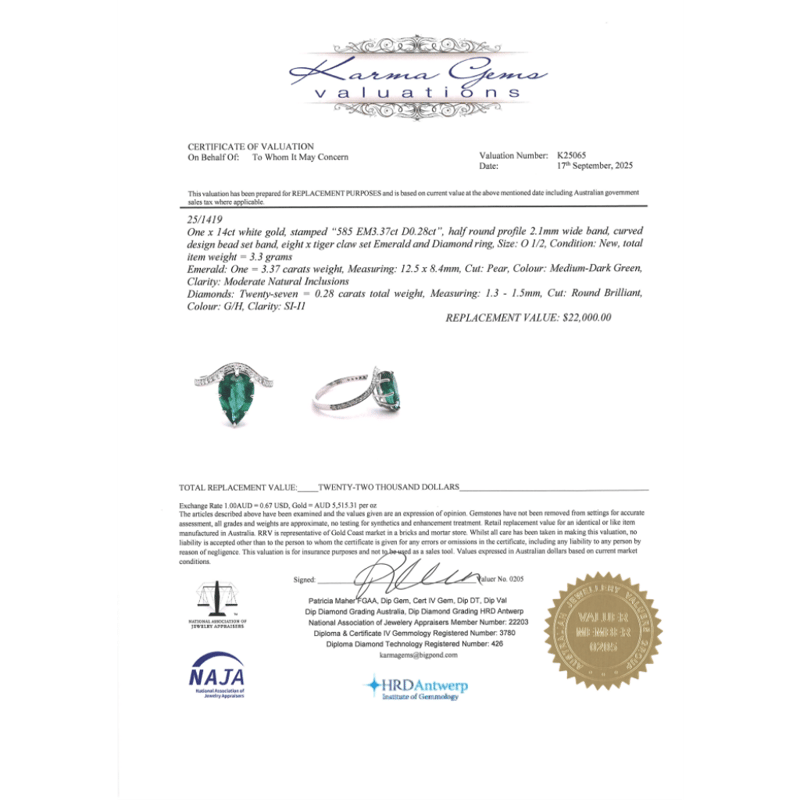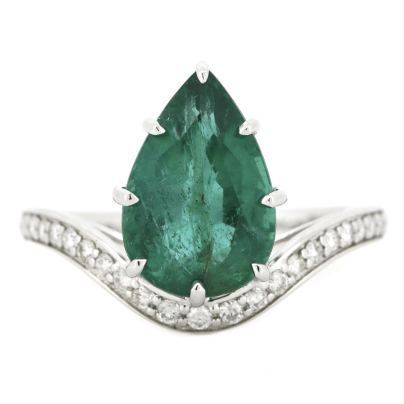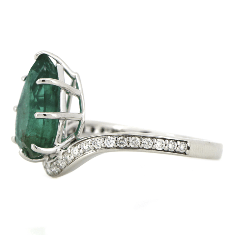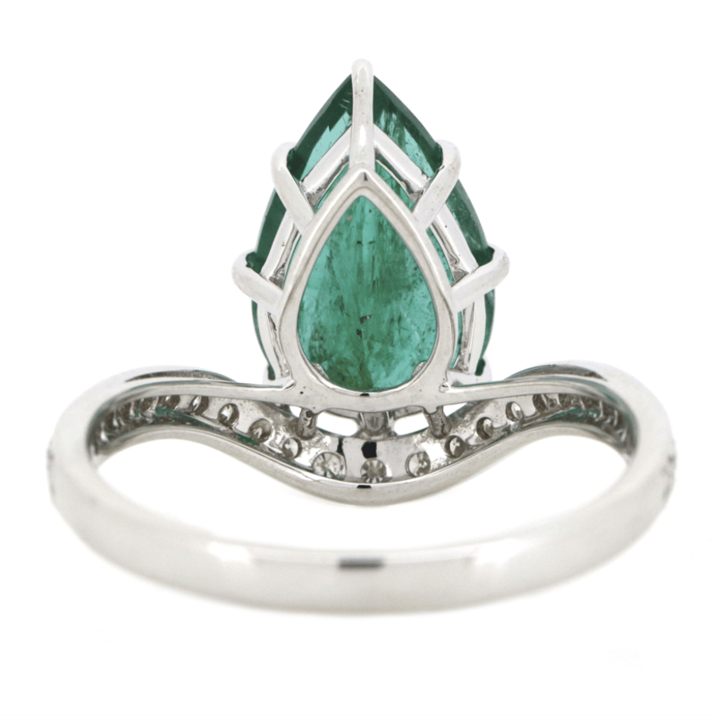 The Centre Features, One Pear Cut, Medium-Dark Green, Emerald (3.37Ct, Moderate Natural Inclusions), Multi-Claw Set. The Band Is Embellished With, 27 Round Brilliant Cut, Diamonds (0.28Ct Tdw, G-H Colour, Si-I1 Clarity), Bead Set. Ring Size O 1/2.