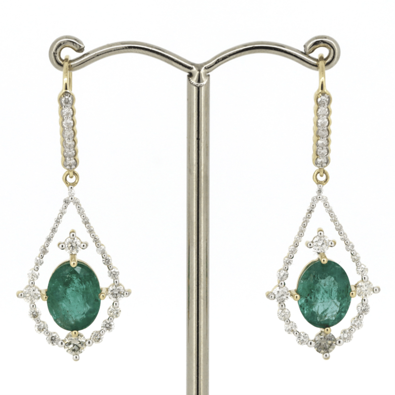 The Design Features, 2 Oval Cut, Bright Green, Emeralds (4.17Ct Tsw, Moderate-Heavy Natural Inclusions), 4 Claw Set. Embellishing The Design Are, 68 Round Brilliant Cut, Diamonds (1.13Ct Tdw, H-J Colour, Si-I2+ Clarity), Bead Set. The Earrings Have Shepherds Hooks.