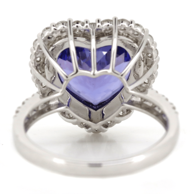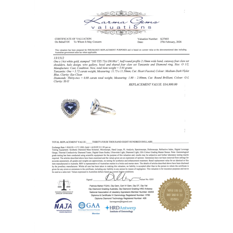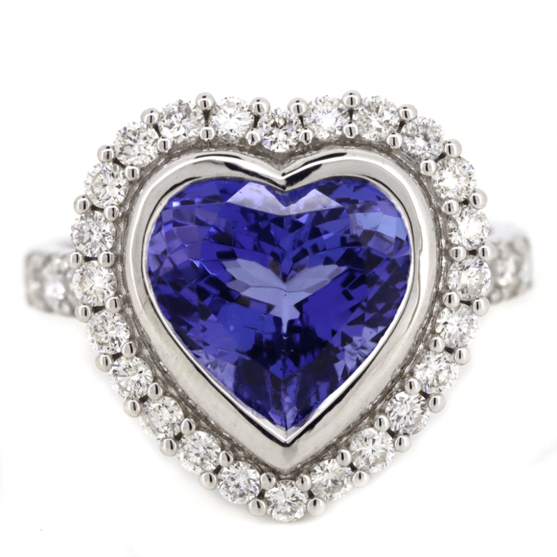 The Centre Features, One Heart Faceted Cut, Tanzanite (5.72Ct, Eye Clean), Bezel Set. Surrounding The Centre In A Halo And Decorating The Band Are, 32 Round Brilliant Cut, Diamonds (0.88Ct Tdw, G-I Colour, Si-I1 Clarity), Claw Set. Ring Size O 1/2.