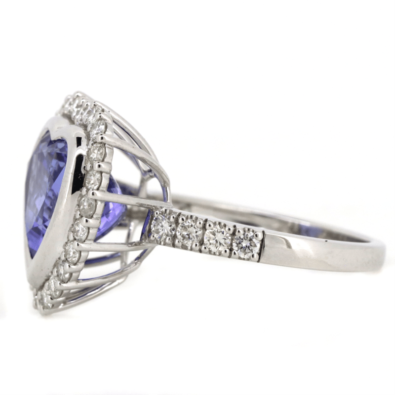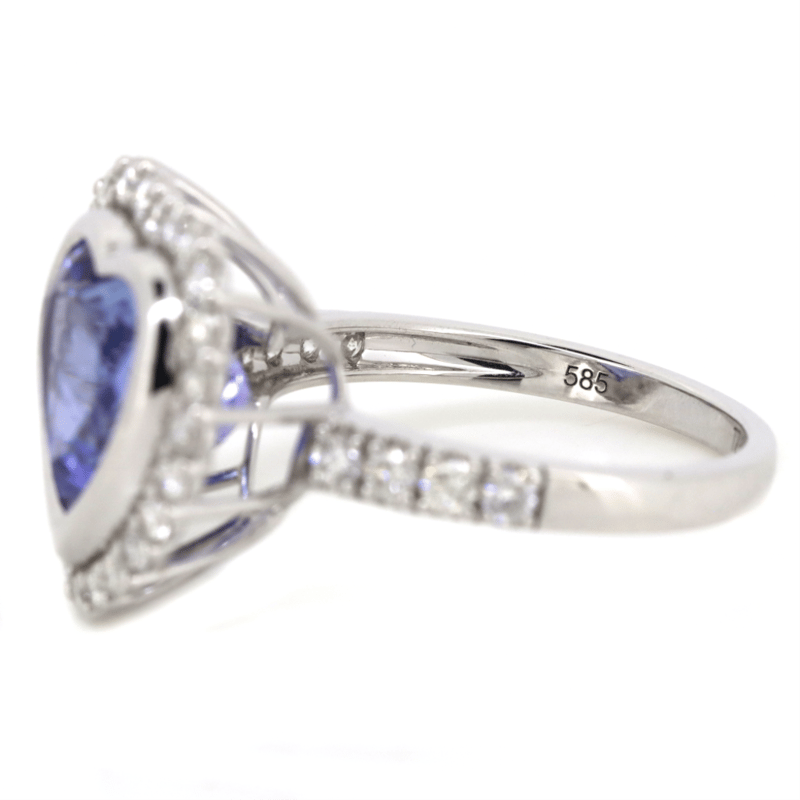 14K WHITE GOLD, TANZANITE AND DIAMOND, HEART SHAPED HALO RING.