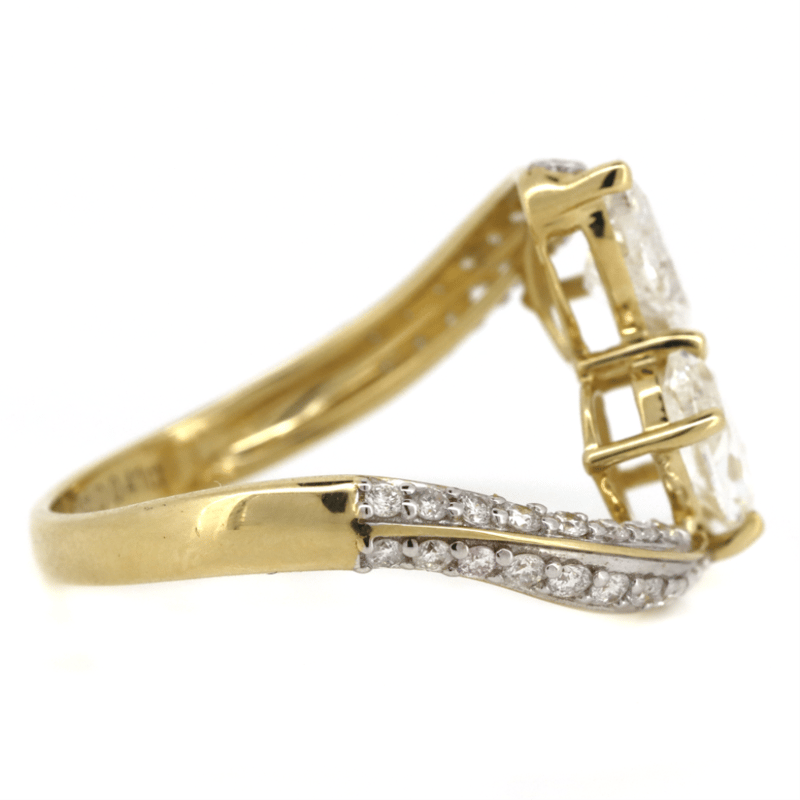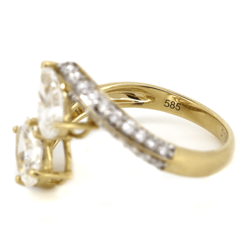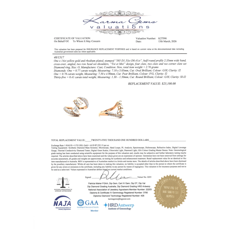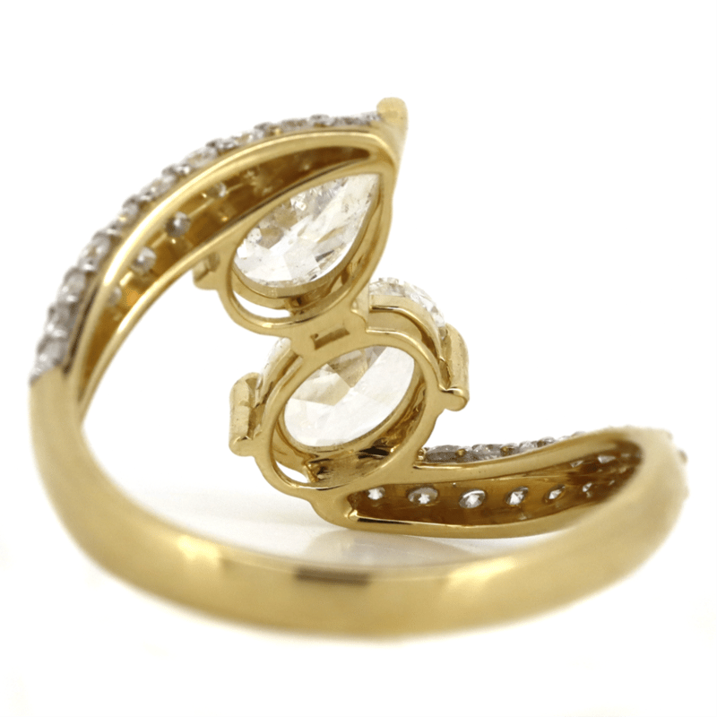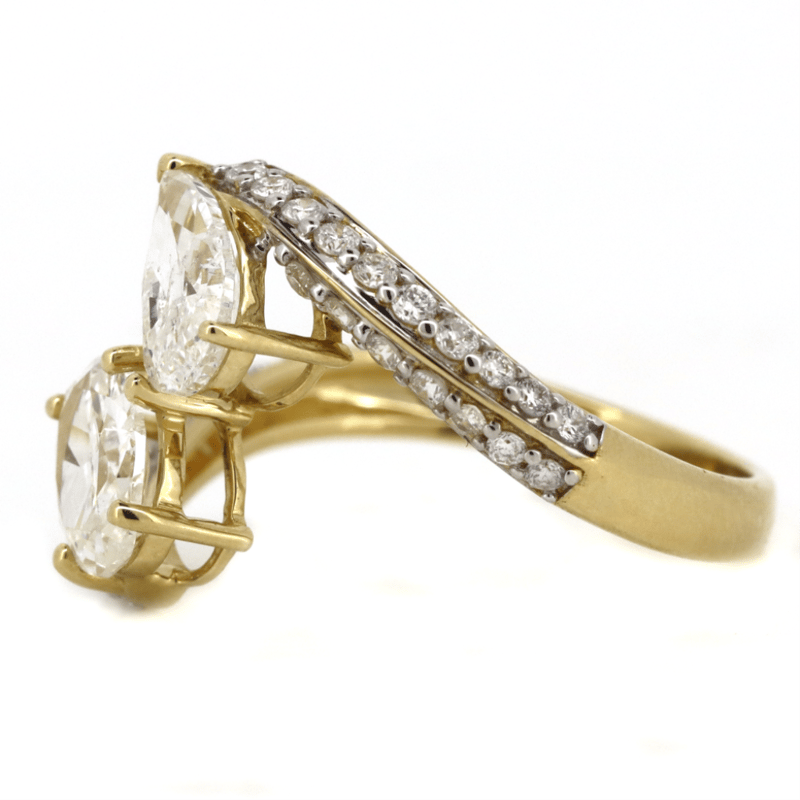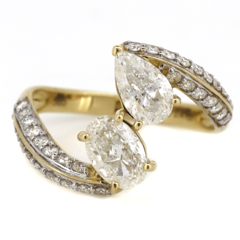 14K YELLOW GOLD AND DIAMOND, "TOI ET MOI" RING. The Design Features, One Oval Brilliant Cut, Diamond (0.77Ct, G-H Colour, I2 Clarity) And One Pear Brilliant Cut, Diamond (0.76Ct, F-G Colour, I2 Clarity), Claw Set. Encompassing The Design Are, 35 Round Brilliant Cut, Diamonds (0.41Ct, G-H Colour, Si-I2 Clarity), Pip Set With Rhodium Plating. Ring Size O. Valuations Provided by an Independent Third-Party Professional Not Directly Associated With Lloyds Auctions at AUD $$25,100.00This valuation has been conducted by an independent third-party professional. The valuation amount is an assessment by the issuing valuer and does not reflect the auction value of the item. Any inquiries regarding the valuation should be directed to the issuing valuer (refer to contact details on the certificate), as Lloyds Auctions has no affiliation or influence over the valuation, the valuer, or the stated amount. Condition: Good - Refer Images 0645968+5118