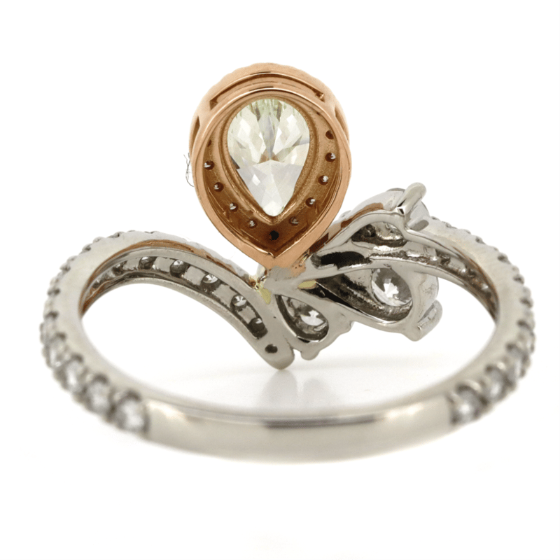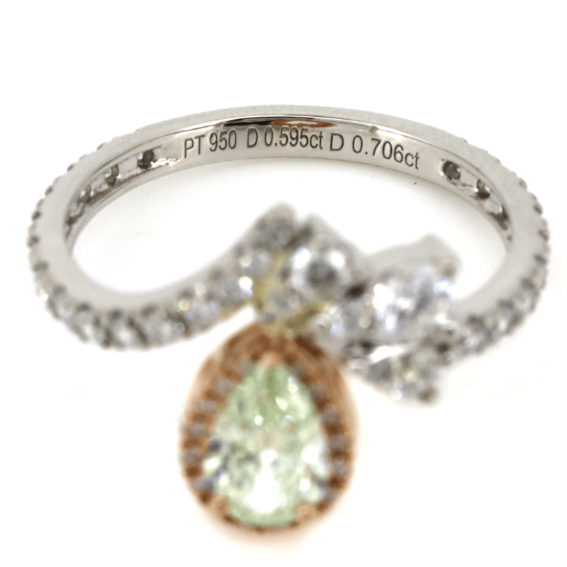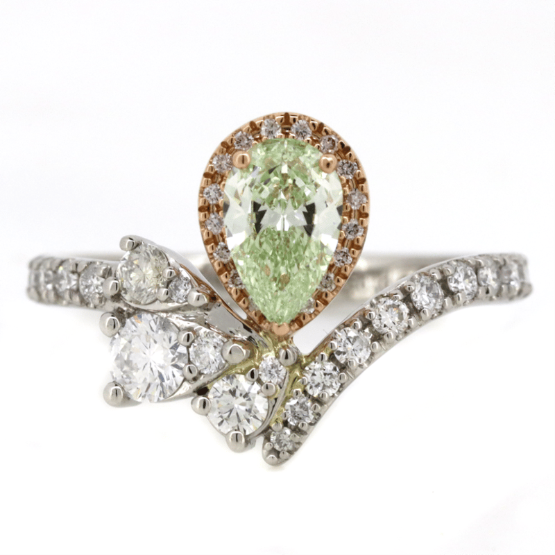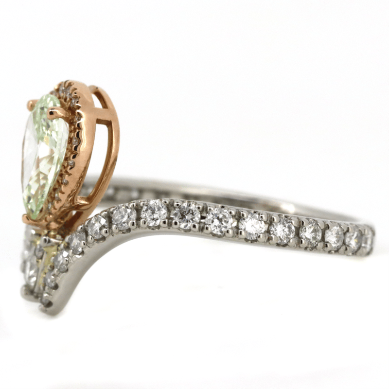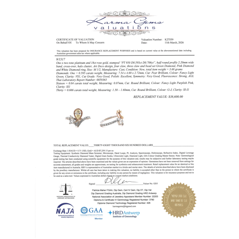 The Centre Features, One Pear Brilliant Cut, Green Diamond (0.595Ct, Vs1 Clarity, Agl Cert: 0059365), 3 Claw Set In Rose Gold. Decorating The Halo Are, 16 Round Brilliant Cut, Fancy Pink Diamonds (0.04Ct Tdw, Si Clarity), Micro Claw Set In Rose Gold. Embellishing The Design Are, 30 Round Brilliant Cut, Diamonds (0.666Ct Tdw, G-I Colour, Si-I1 Clarity), Claw/Pip Set. Ring Size M 1/2.