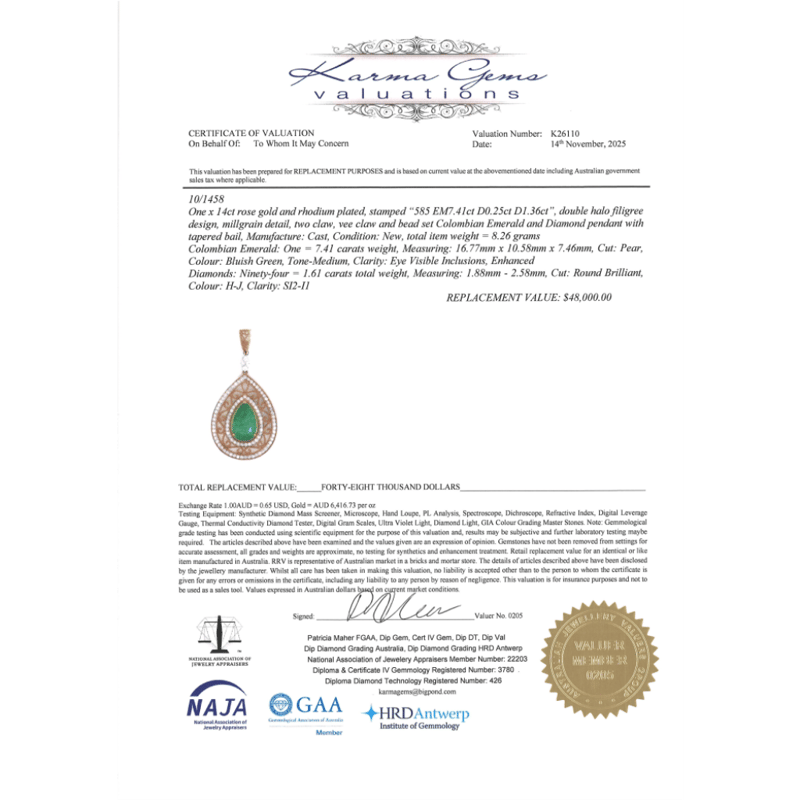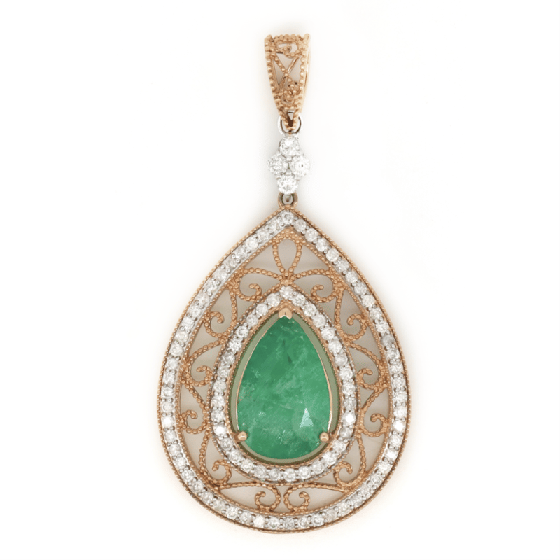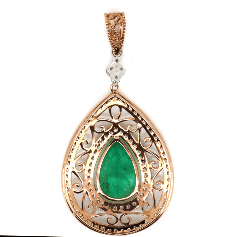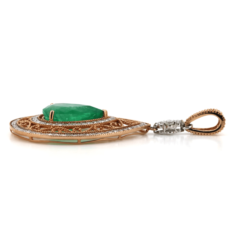14K ROSE GOLD, 7.41CT COLOMBIAN EMERALD AND DIAMOND, DECORATIVE STATEMENT PENDANT.