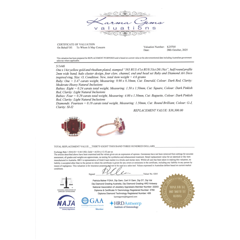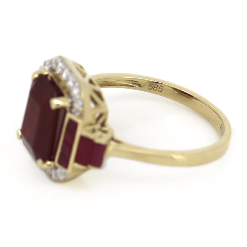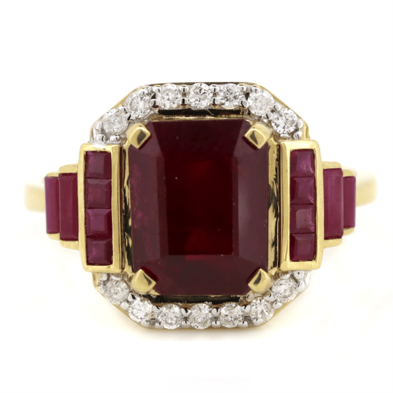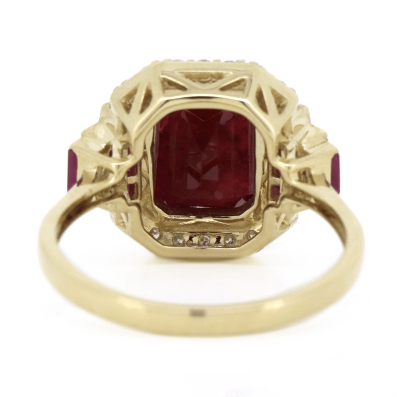 The Centre Features, One Emerald Cut, Dark Red, Ruby (3.47Ct, Moderate-Heavy Inclusions), 4 Claw Set. Surrounding The Centre In A Partial Halo And Decorating The Shoulders Are, 14 Round Brilliant Cut, Diamonds (0.18Ct Tdw, G-J Colour, Si-2 Clarity), Bead/Channel Set In Yellow Gold. Accompanied By, 8 Square Cut, Dark Pinkish-Red, Rubies (0.24Ct Tsw, Light Natural Inclusions), And 4 Baguette Cut, Dark Pinkish-Red, Rubies (0.29Ct Tsw, Light Natural Inclusions), Channel Set. Ring Size O.