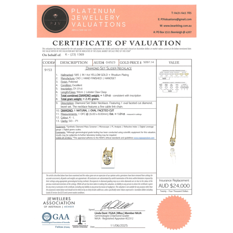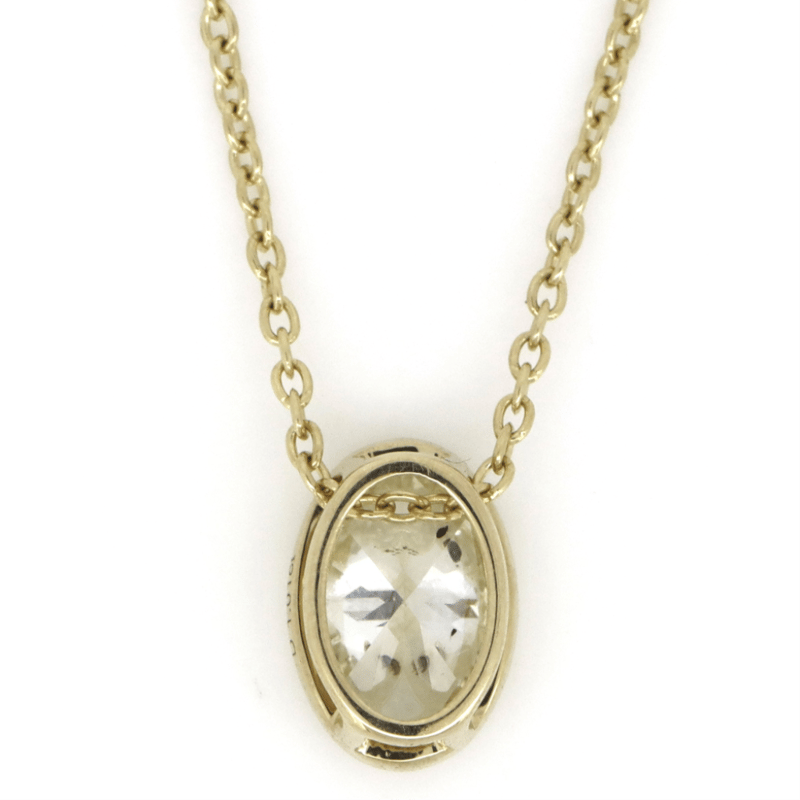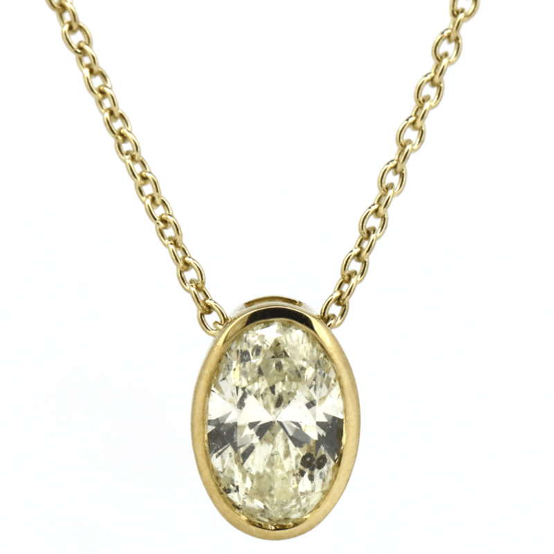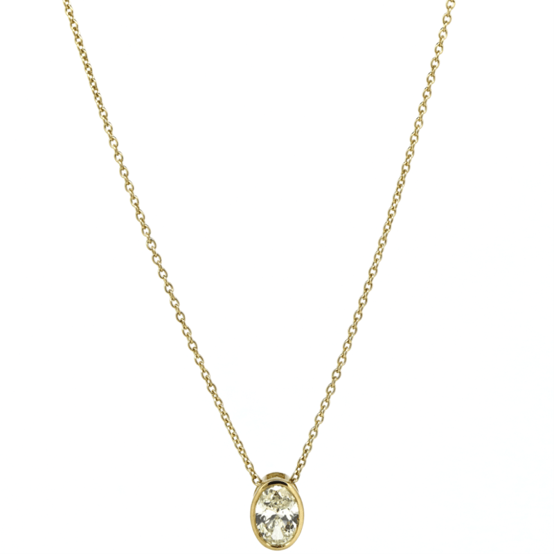 The Pendant Features, One Oval Faceted Cut, Diamond (1.01Ct, K-L Colour, Si3-P1 Clarity), Bezel Set. The Necklace Features A Fine Cable Link Chain With A Lobster Claw Clasp. Necklace Length Is 50Cm.