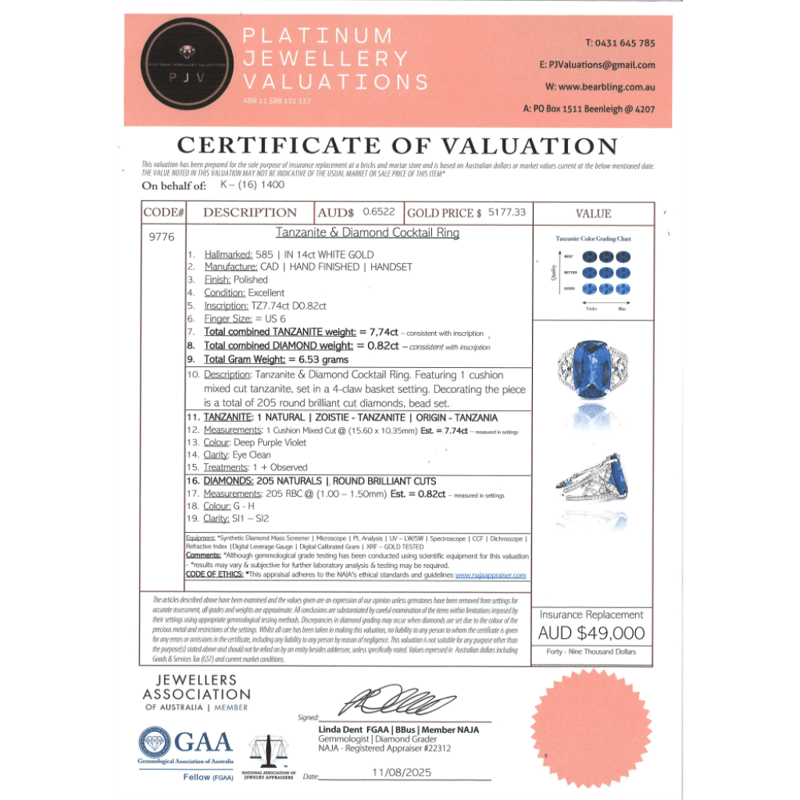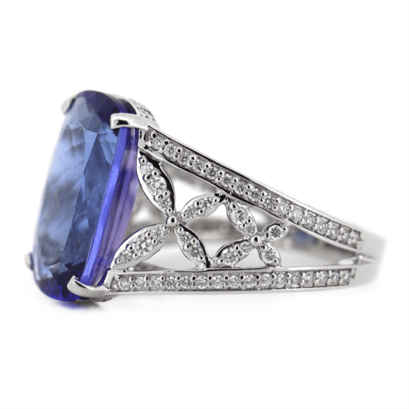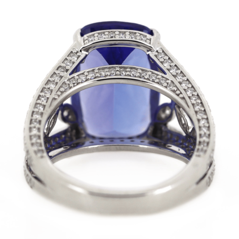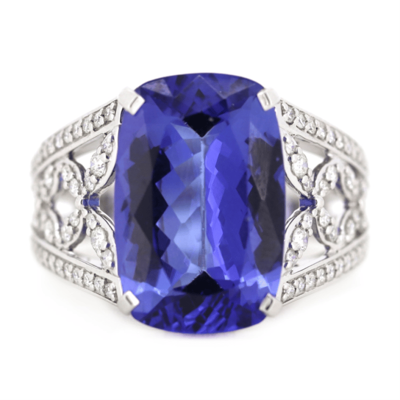 The Centre Features, One Cushion Cut, Deep Purple Violet, Tanzanite (7.74Ct, Eye Clean Clarity, Enhanced), 4 Claw Set. Embellishing The Band Design Are, 205 Round Brilliant Cut, Diamonds (0.82Ct Tdw, G-H Colour, Si1-Si2 Clarity), Bead Set. Ring Size L 1/2.