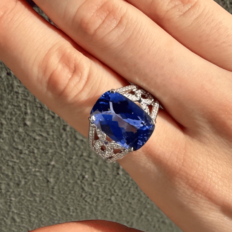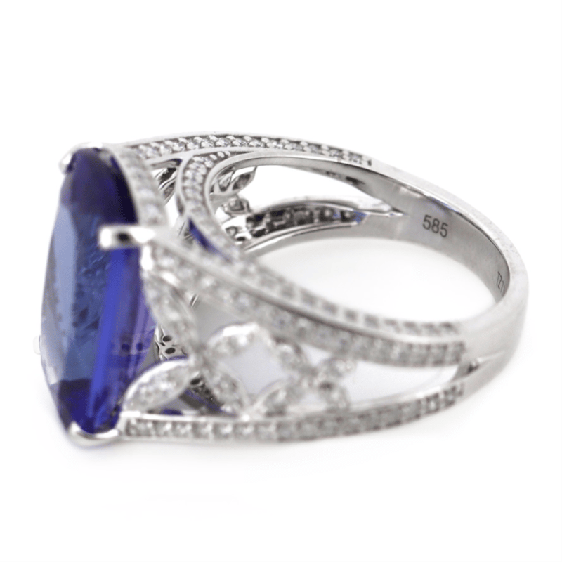 14K WHITE GOLD, 7.74CT TANZANITE AND DIAMOND, COCKTAIL RING.