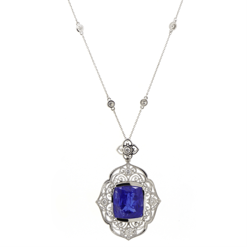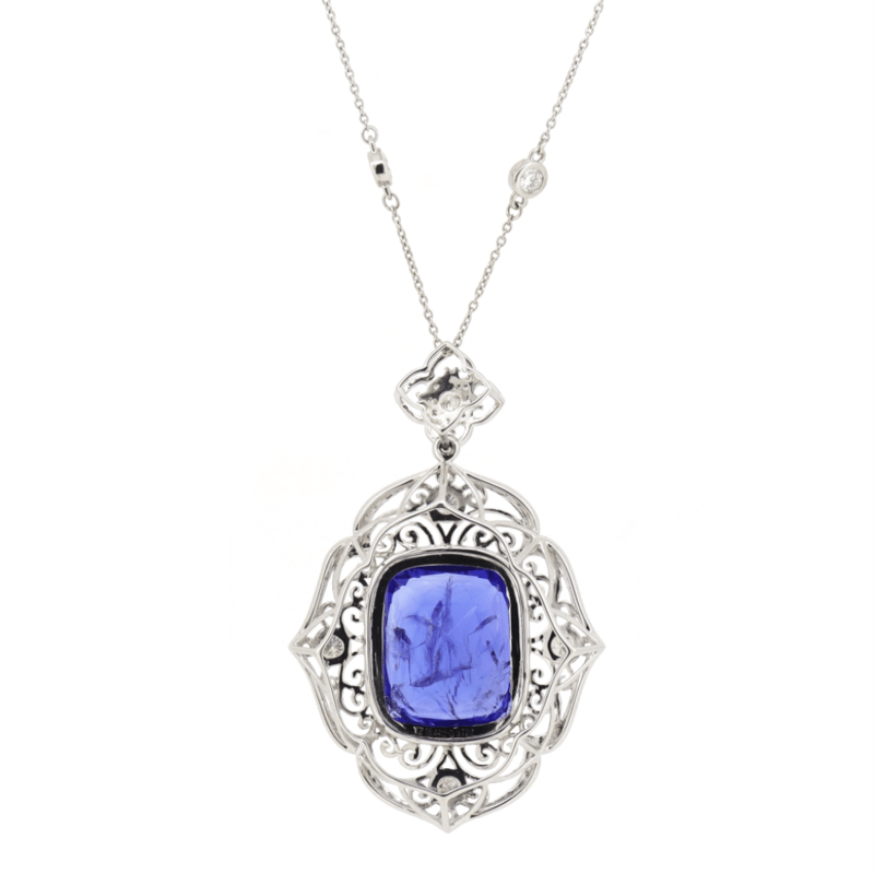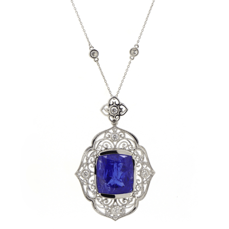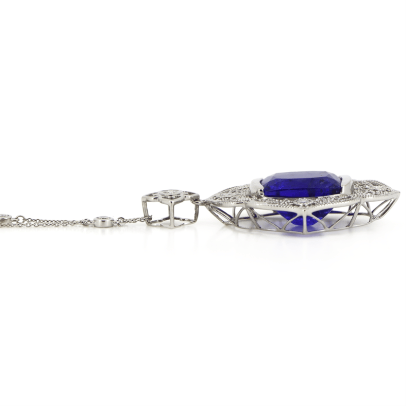 14K WHITE GOLD, 16.44CT TANZANITE AND DIAMOND, ORNATE STATEMENT PENDANT NECKLACE.