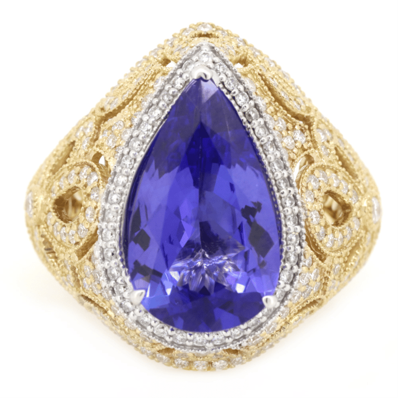 The Centre Features, One Pear Cut, Deep Moderate Violet Blue, Tanzanite (5.80Ct, Slightly Included, Enhanced), 3 Claw Set. In White Gold. Embellishing The Design Are, 247 Round Brilliant Cut, Diamonds (1.335Ct Tdw, G-H Colour, Si1-Si2 Clarity), Micro-Bead Set. Ring Size P 1/2.