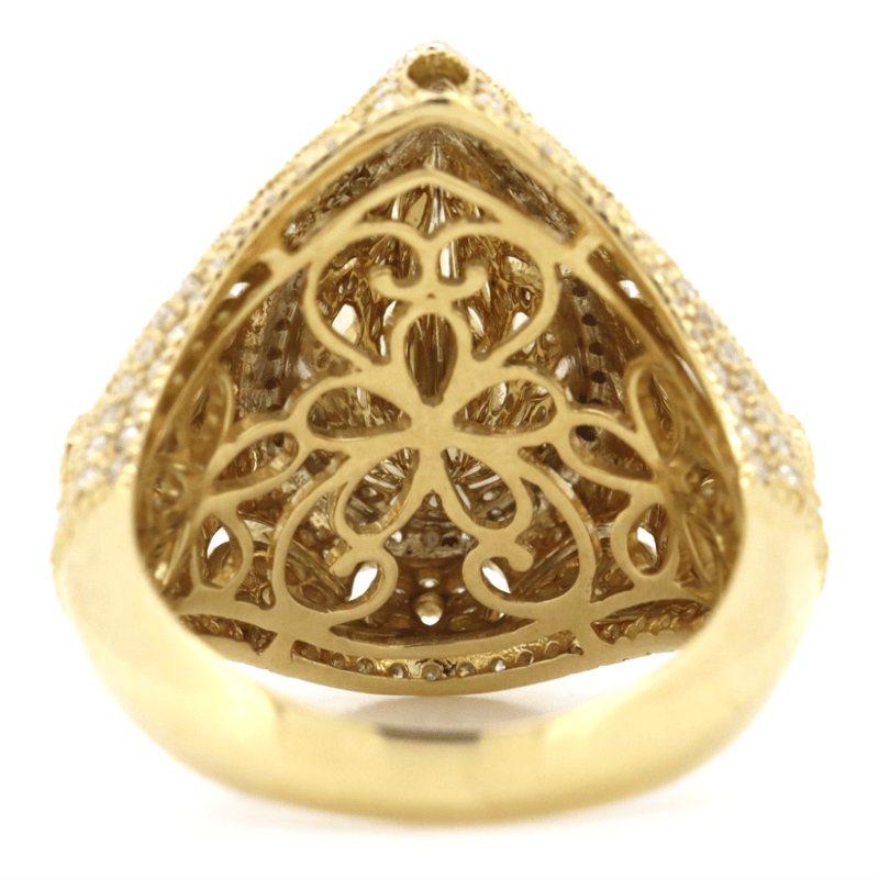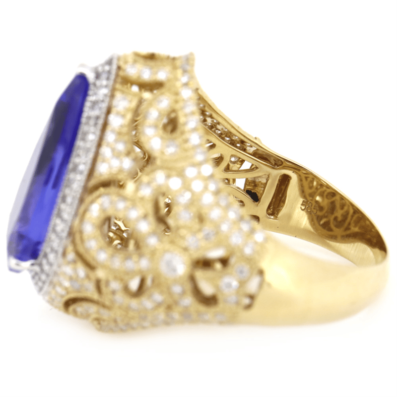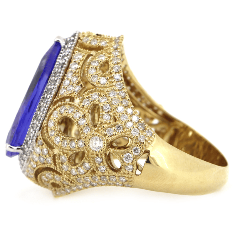 14K YELLOW/WHITE GOLD, TANZANITE AND DIAMOND, ORNATE COCKTAIL RING.
