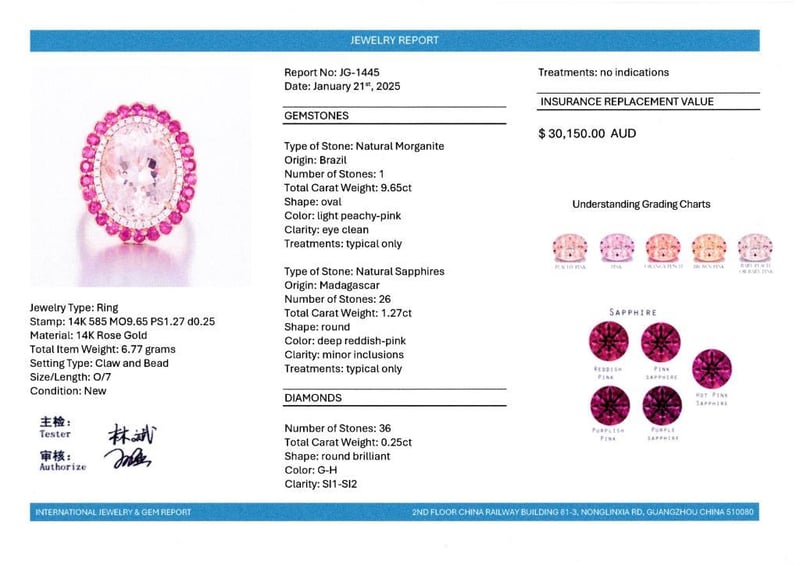 Featuring Centre, One Oval Cut, Light Peachy-Pink, Brazilian Morganite (9.65Ct, Eye Clean), Claw Set, With 26 Round Cut, Deep Reddish-Pink Madagascan Sapphires (1.27Ct Tsw, Minor Inclusions), Bead Set, And 36 Round Brilliant Cut Diamonds (0.25Ct Tdw, G-H Colour, Si1-Si2 Clarity), Bead Set. Ring Size O.