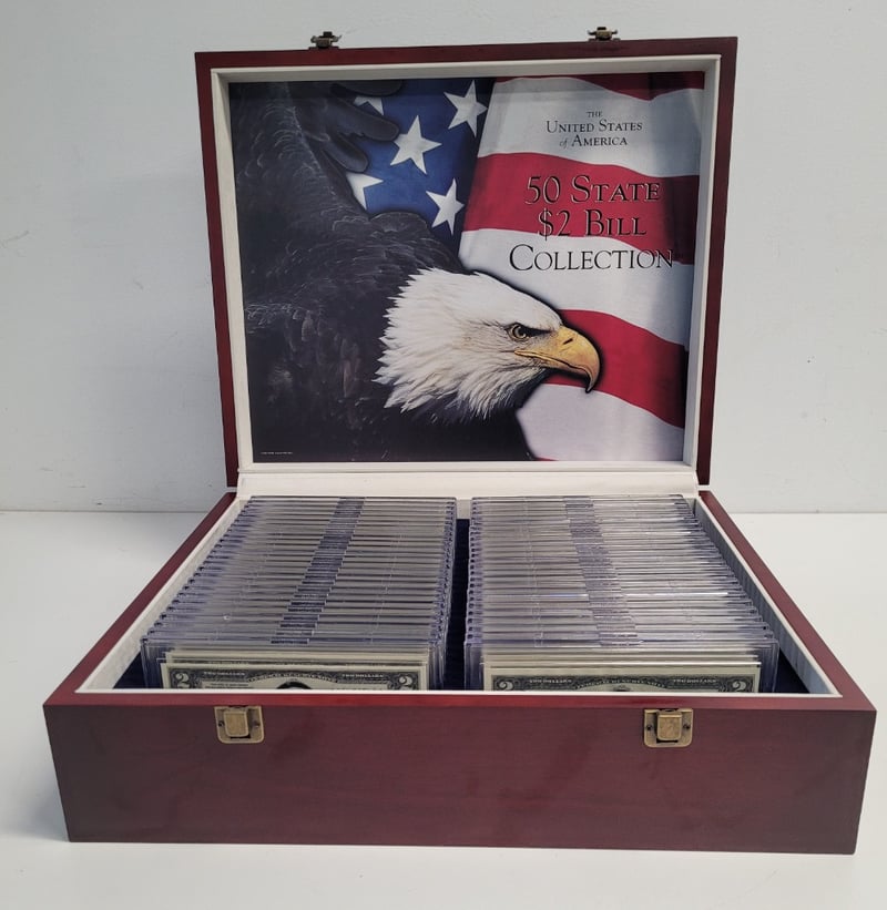 USA NOTE COLLECTIONUsa 50 State Two Dollar Bill Collection.The Collection Is Show Cased In A Beautifully Presented Deluxe Display Box, With A Rich Mahogany Finish. The Reverse Side Shows The Iconic Depiction Of The Signing Of The Declaration Of Independence.Each Note Is In An Individual Casing Depicting An Iconic Scene From Each State, With The State Name On The $2 Note. All Notes Are Still Legal Tender, And This Probably The Only Set In Australia.488543+15