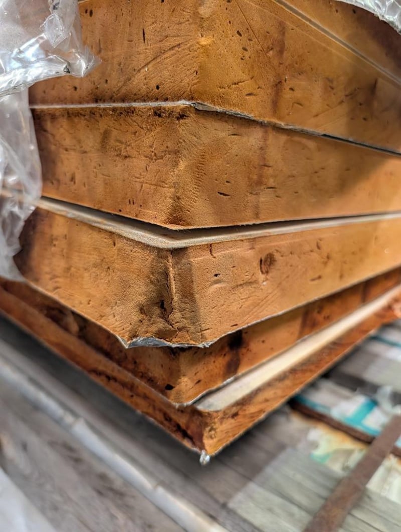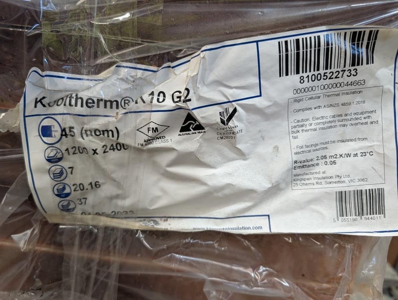 RRP $2,591, Kingspan Kooltherm K10 G2 Insulation Core Soffit Board Dimensions: 1200mm x 2400mm Insulation: 45mm Weight: 37kg Bid Per Sheet Must Take 7 Kingspan Kooltherm K10 G2 Insulation Core Soffit Board K10 FM Soffit Board is a fibre-free rigid thermoset phenolic insulation core, sandwiched between an upper tissue-based facing and a lower facing of reflective aluminium foil adhesively bonded to the insulation core during manufacture. Kooltherm K10 G2 Features Australian made CodeMark-certified for NCC compliance NCC and AS/NZS 4859.1:2018 compliant Fibre-free, closed cell insulation core Maintains a clear cavity Note: Sheets Show Signs Of Damage