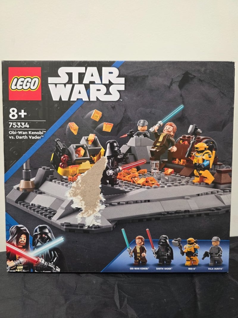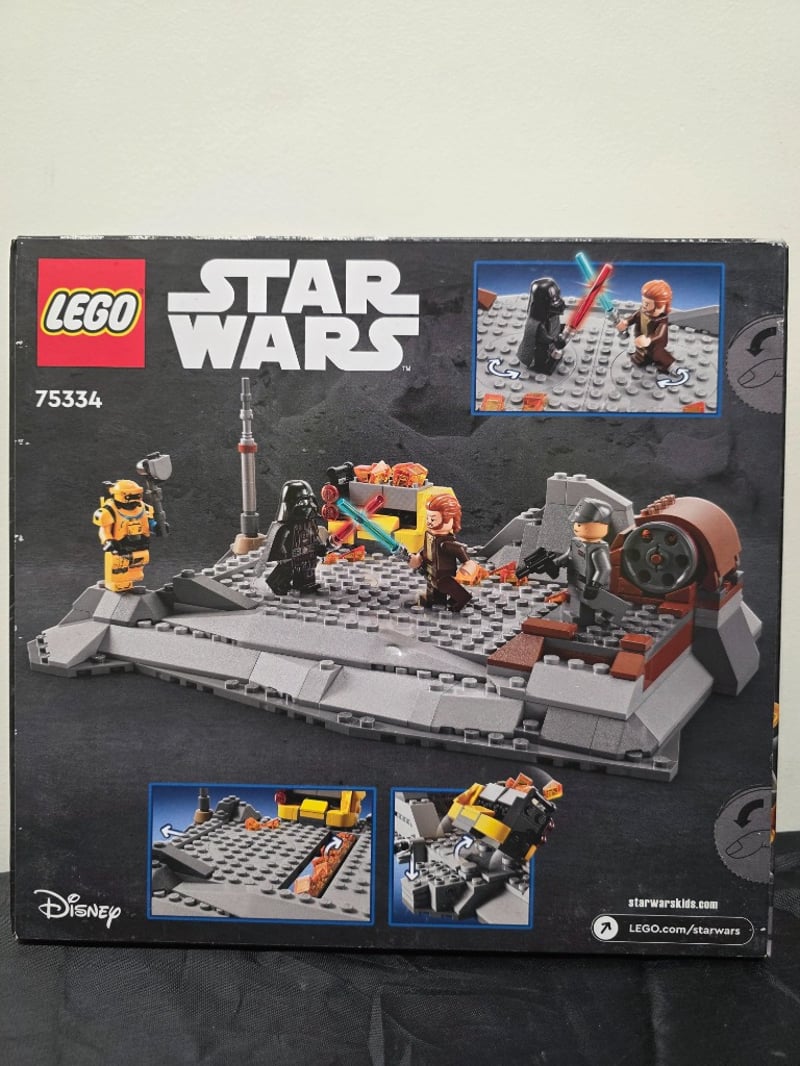 Unopened Lego Star Wars Set 75334 Featuring An Iconic Duel Between Obi-Wan Kenobi And Darth Vader. Includes Minifigures Of Obi-Wan Kenobi, Darth Vader, Bd-1 Droid, And Tala Durith, With Lightsabers And Accessories. The Set Depicts A Detailed Mustafar-Inspired Battle Platform With Lava Elements, Droids, And Environmental Details. Recommended For Ages 8+. Original Retail Packaging With Vibrant Graphics Showing The Action Scene And Minifigure Lineup. Sealed Box In Excellent Condition With No Visibl