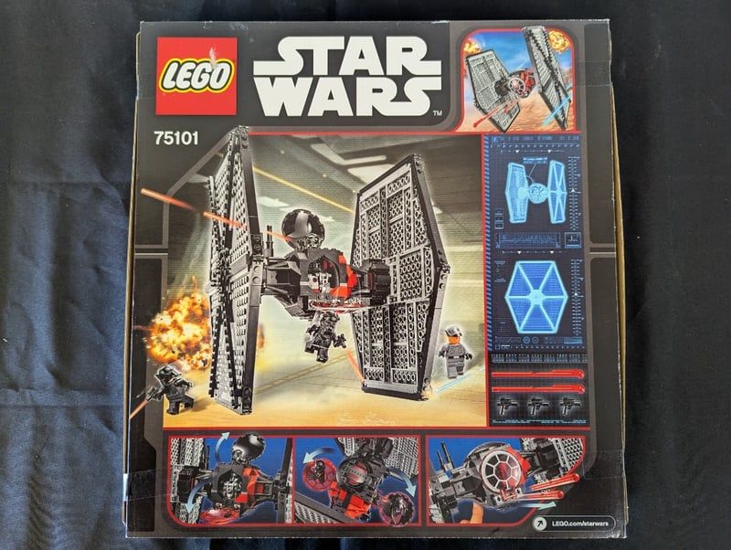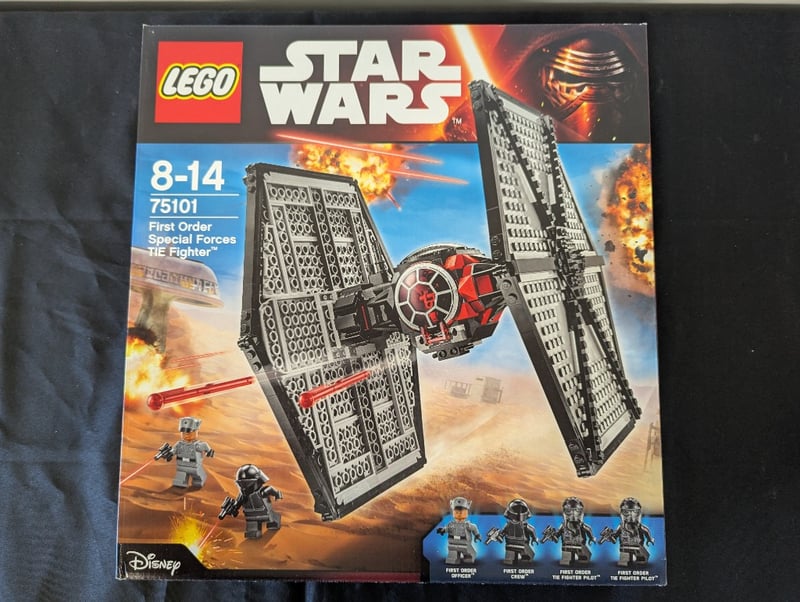 Lego Star Wars Set 75101 Featuring The First Order Special Forces Tie Fighter From The Force Awakens. Complete Boxed Set Includes Minifigures (First Order Officer, First Order Crew X3) And Detailed Tie Fighter Model With Opening Cockpit And Fold-Out Wings. Box Displays Original Retail Packaging With Bright Graphic Imagery Of The Iconic Starfighter Against Desert Landscape Backdrop