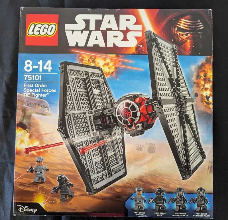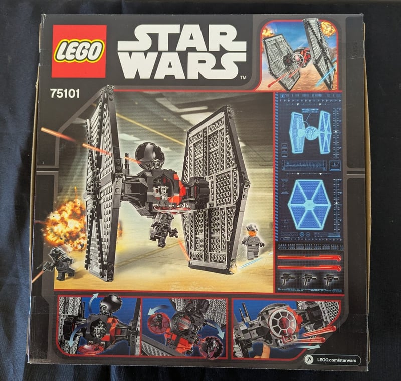 Lego Star Wars Set 75101 Featuring The First Order Special Forces Tie Fighter With Detailed Angular Wing Construction In Black And Red, Includes Four Minifigures (First Order Officer, First Order Crew, And Two First Order Tie Fighter Pilots), Original Box With Comprehensive Imagery And Schematic Displays, Age-Appropriate For 8-14 Year