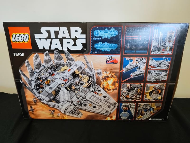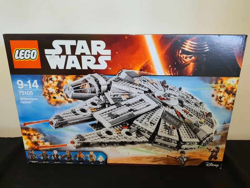 LEGO STAR WARS 75105 MILLENNIUM FALCON SETItem Size: Height: 52cm, Width: 84cm, Depth: 28cm, Weight: 5KgLego Star Wars Set 75105 Featuring The Iconic Millennium Falcon Spacecraft. Complete With Minifigures Including Han Solo, Chewbacca, Rey, Finn, And Additional Characters. Box Shows Original Force Awakens Era Branding With Explosion-Themed Graphics. Set Includes Detailed Brick Construction With Opening Cockpit, Landing Gear Details, And Authentic Star Wars Aesthetic. Includes Instruction Manual And Component Diagrams Visible On Packaging Rear.Condition: Good - Refer To Images584518+32