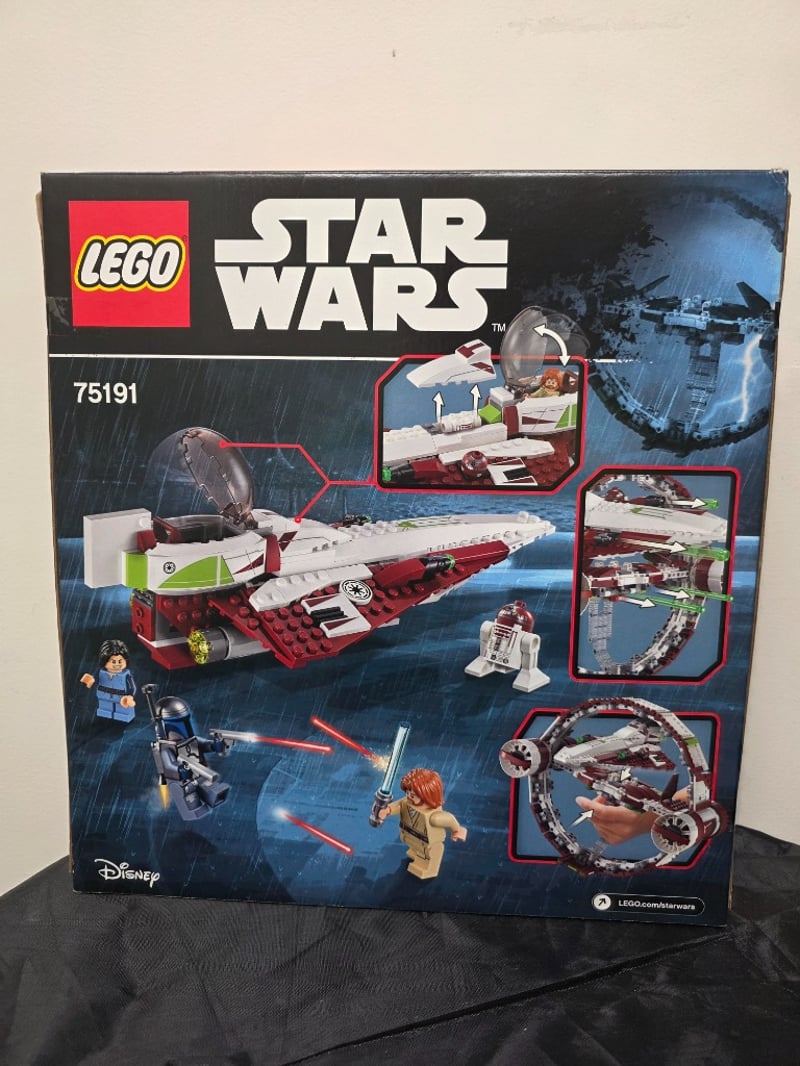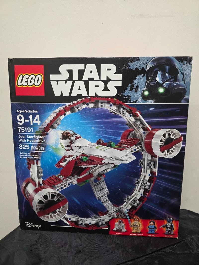 Lego Star Wars Set 75191 Featuring A Buildable Jedi Starfighter With Detachable Hyperdrive Ring. Includes 825 Pieces And Four Minifigures (R2-D2, Jedi Padawan, Jedi Master, And Darth Vader). Recommended For Ages 9-14. Original Box Shows Wear Consistent With Age And Storage.