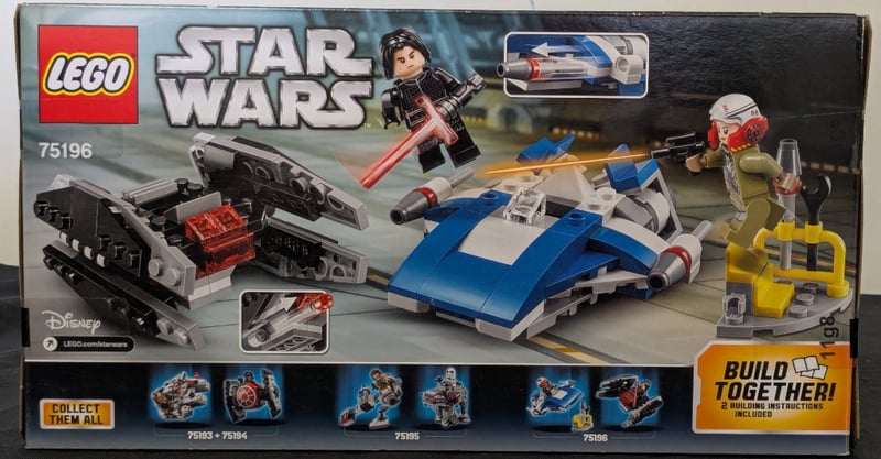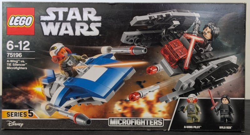 Lego Star Wars Microfighters Set 75196 Featuring A Blue A-Wing Starfighter With A-Wing Pilot Minifigure And A Black Tie Silencer With Kylo Ren Minifigure. Series 5 Collection Item Includes Two Buildable Spacecraft With Firing Cannons, Landing Gear Details, And Authentic Character Representations. Original Packaging Shows Retail Condition With Complete Contents. Suitable For Ages 6-12 And Compatible With Broader Lego Star Wars Construction Ecosystem.