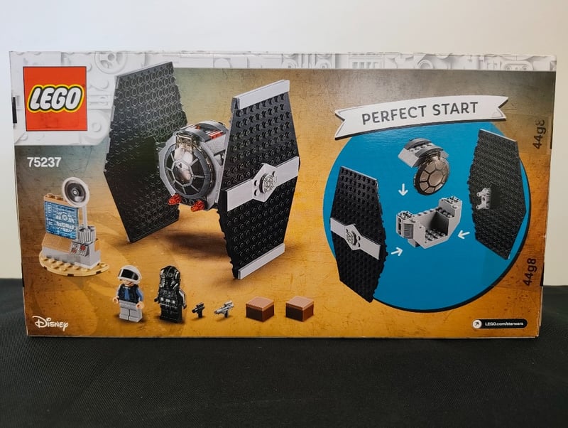 Lego Star Wars Set 75237 Featuring A Buildable Tie Fighter With Opening Cockpit, Control Tower, Minifigures Including Rebel Trooper And Tie Fighter Pilot, And Accessory Pieces. Original Packaging With "Perfect Start" Designation Indicates 4+ Age Rating. Complete With Printed Instruction Manual And Component Layout Visible On Reverse Packaging.