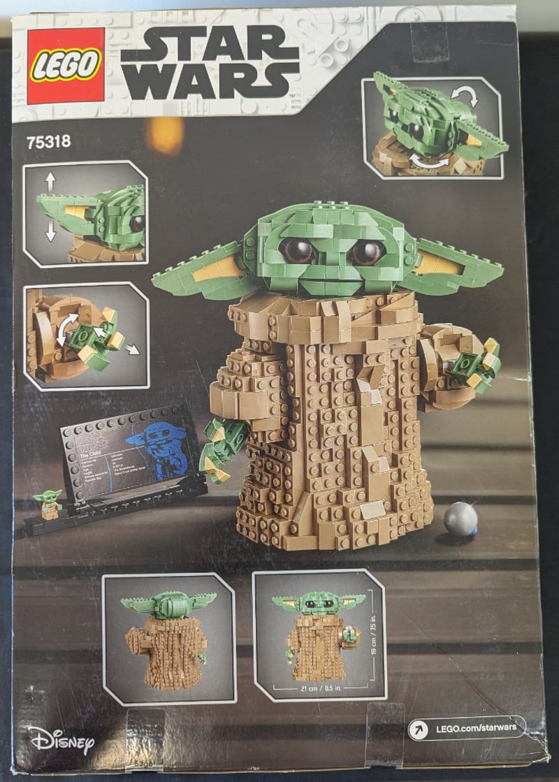 Lego Star Wars Set 75318 Featuring The Child (Grogu) From The Mandalorian Series. Buildable Figure With Green Head And Ears, Tan Robed Body With Articulated Arms And Poseable Hands. Includes Minifigures, Instruction Manual, And Display Base. Age Rating 10+. Construction Set Showcasing Detailed Brick-Built Design With Authentic Character Representation.